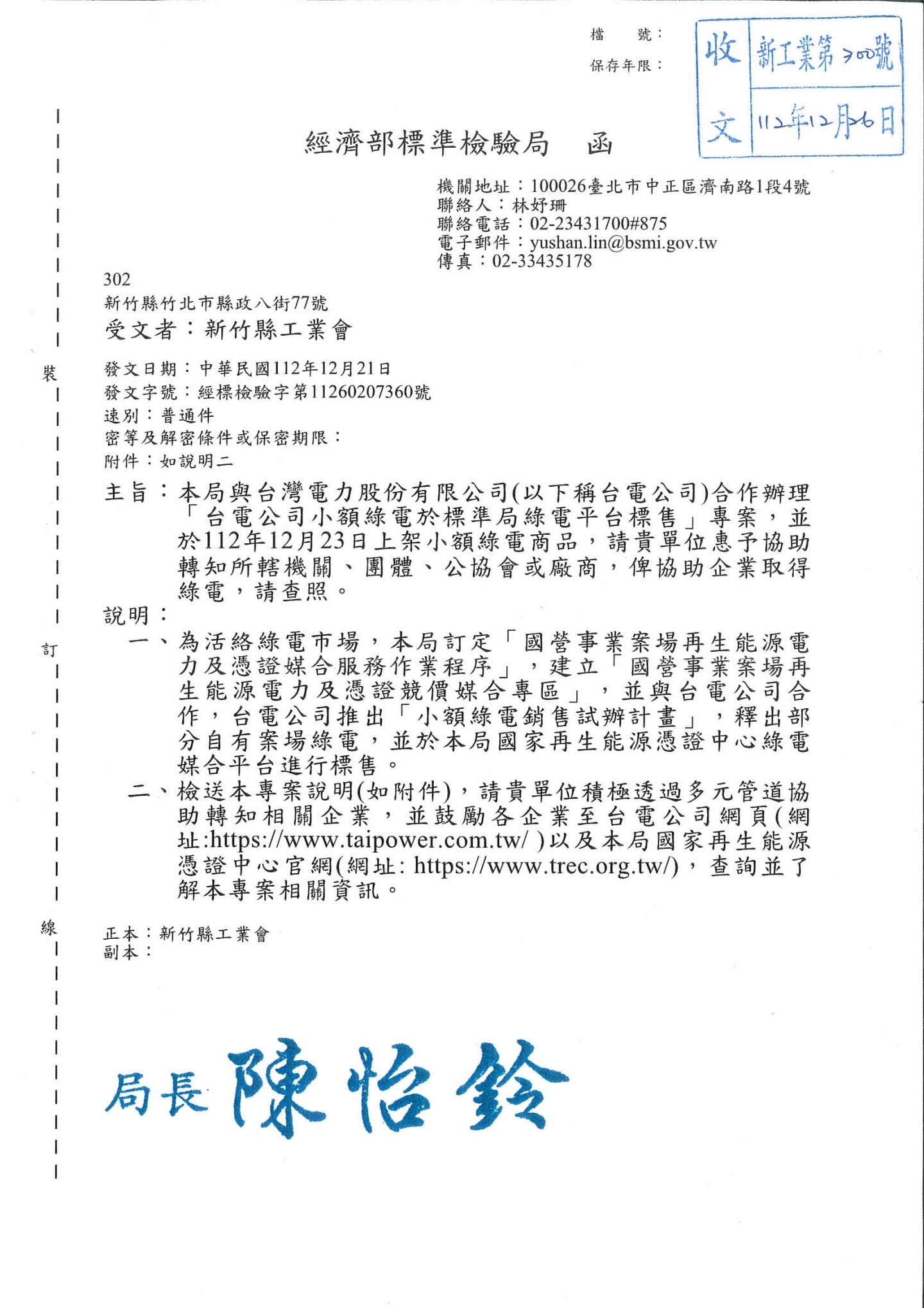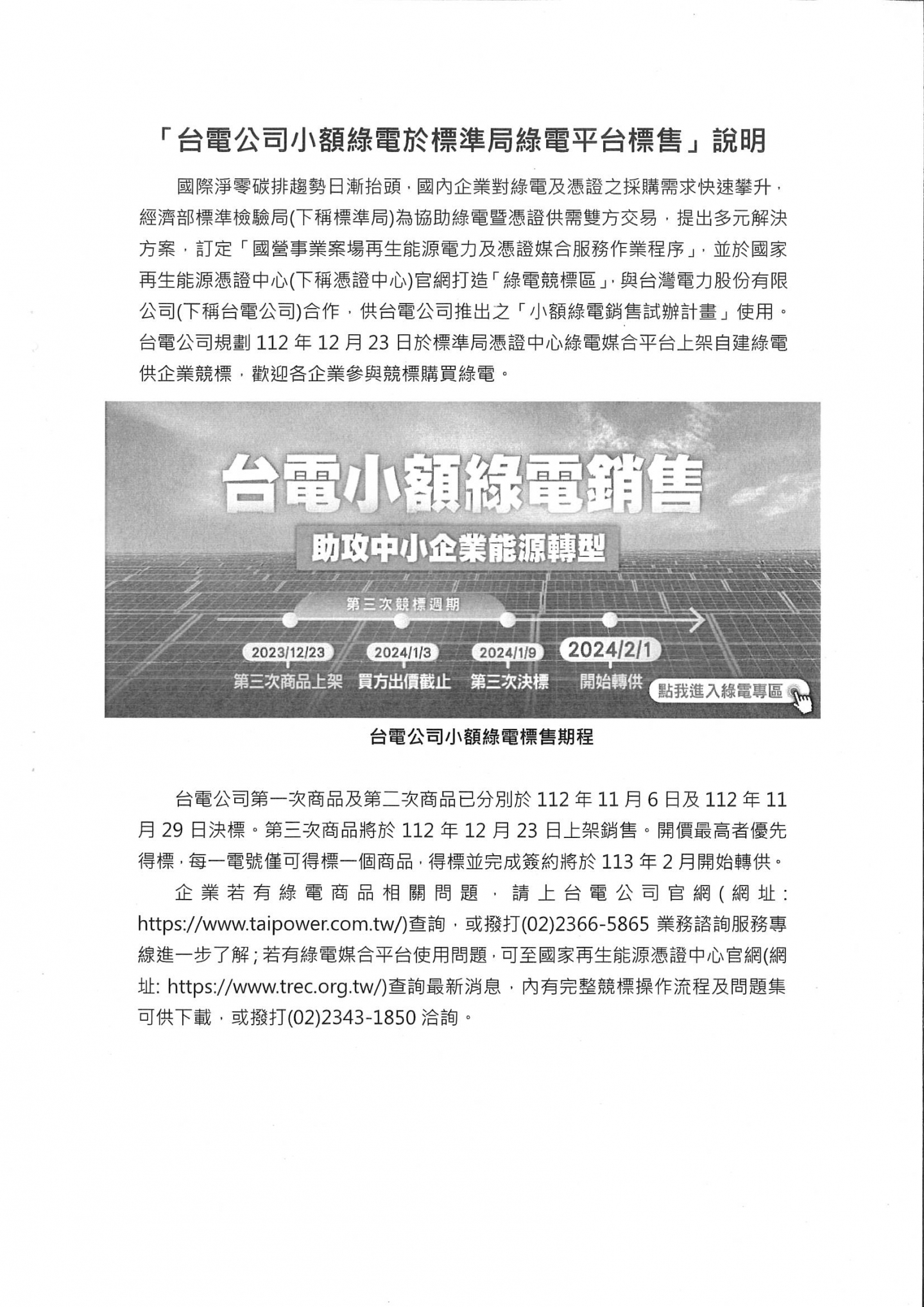 公告台電小額綠電於標準局綠電平台標售專案