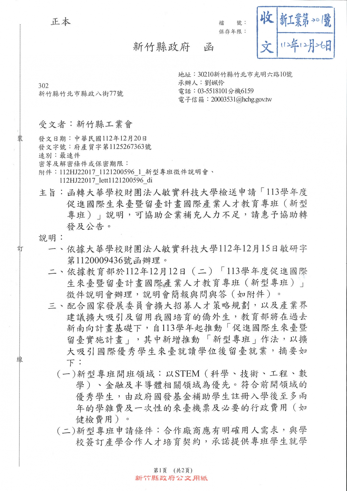 敏實科技大學國際產業人才教育專班說明