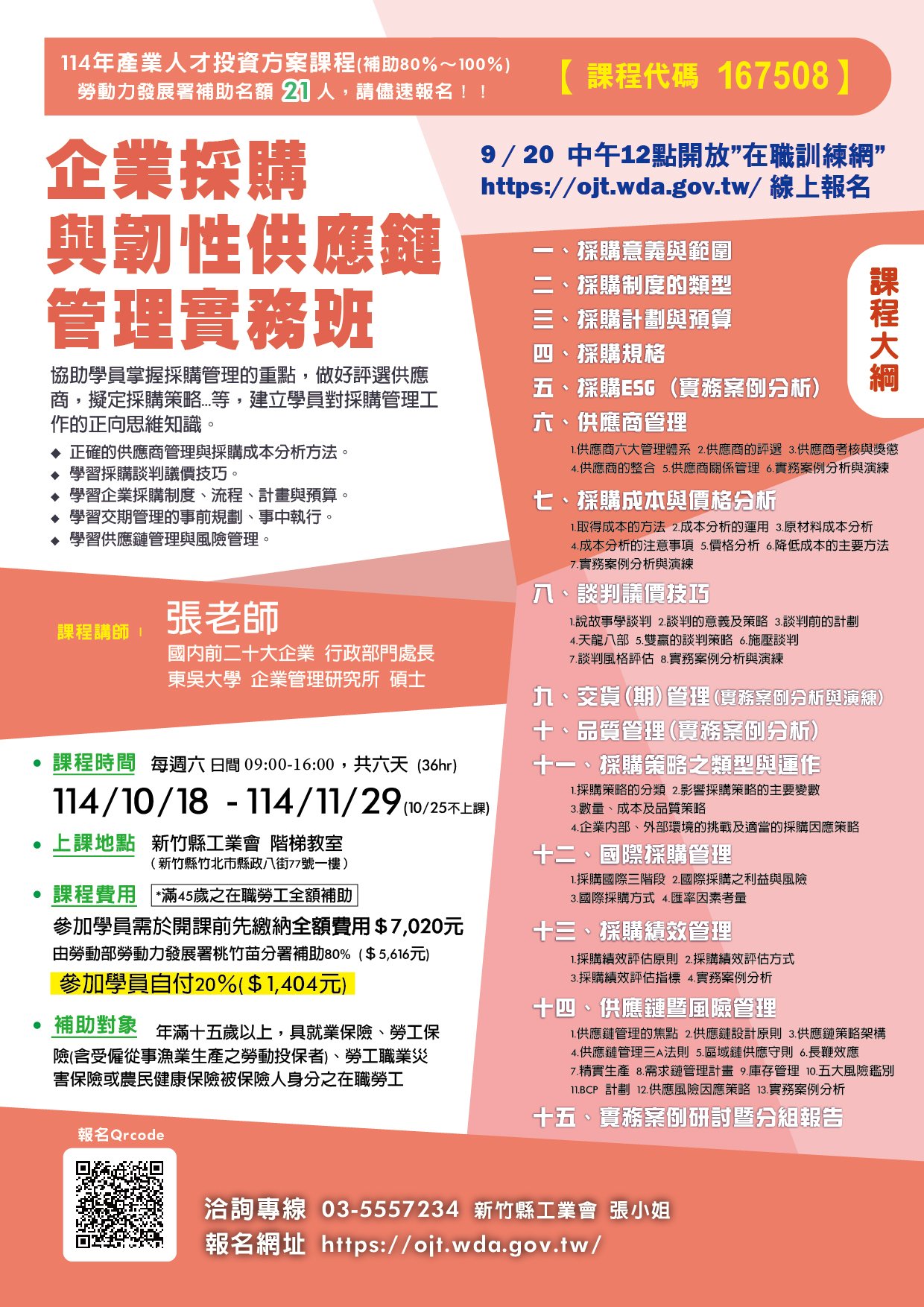 【補助80%-100%】114/10/18 - 11/29 企業採購與韌性供應鏈管理實務班-第7期