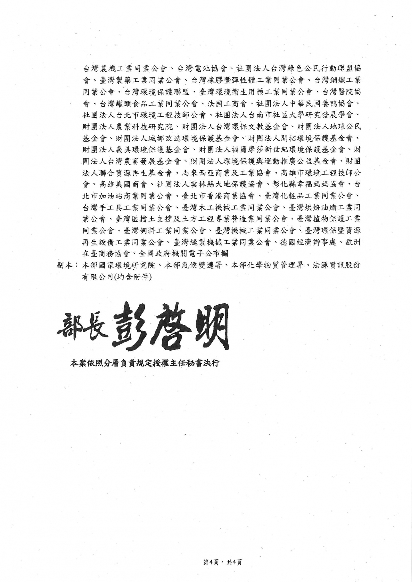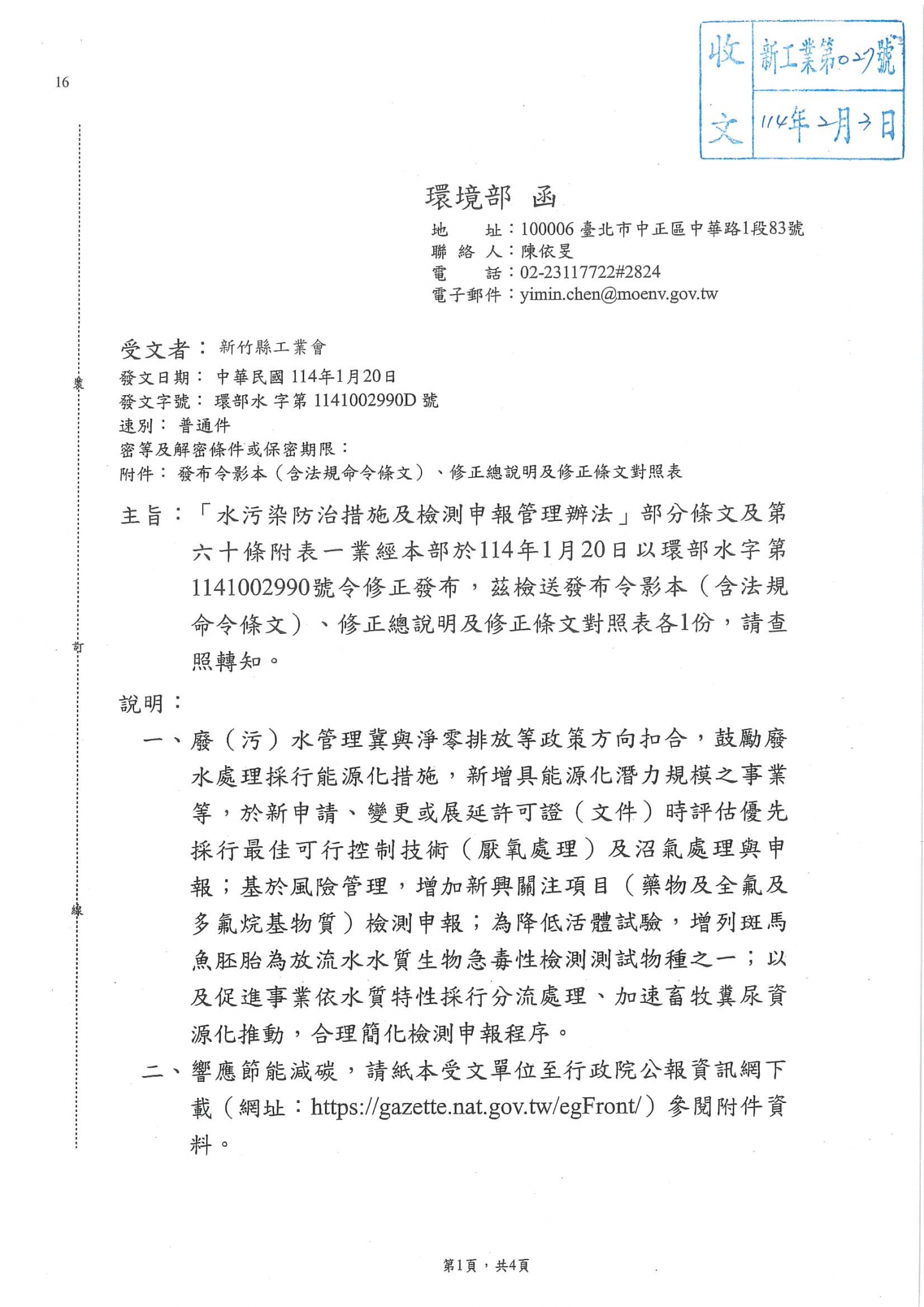 環境部「水汙染防治措施及檢測申報管理辦法」部分條文及第六十條附表一業經本部於114年1月20日以環部水字第1141002990號令修正發布,檢送發布令影本(含法規命令條文)、修正總說明及修正條文對照表各1,請相關企業及工廠查閱