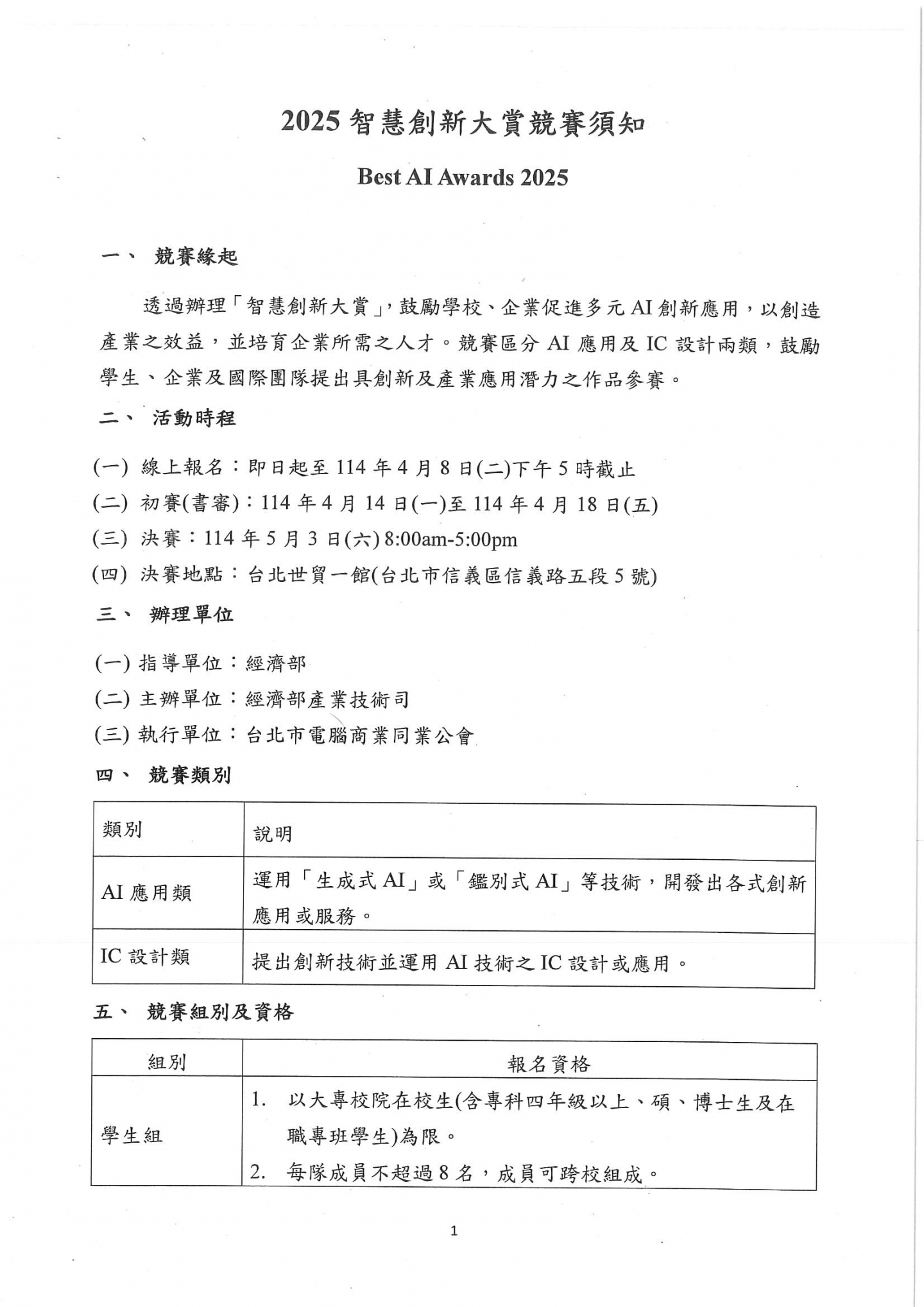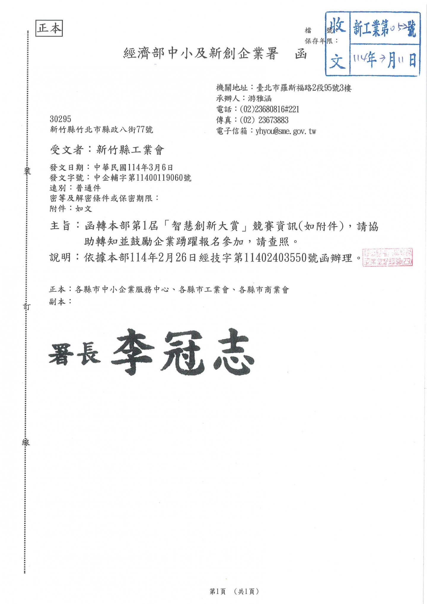 經濟部中小企及新創企業署辦理第1屆「智慧創新大賞」競賽資訊,歡迎企業踴躍報名參加