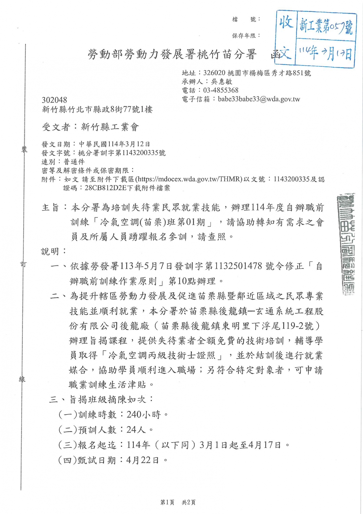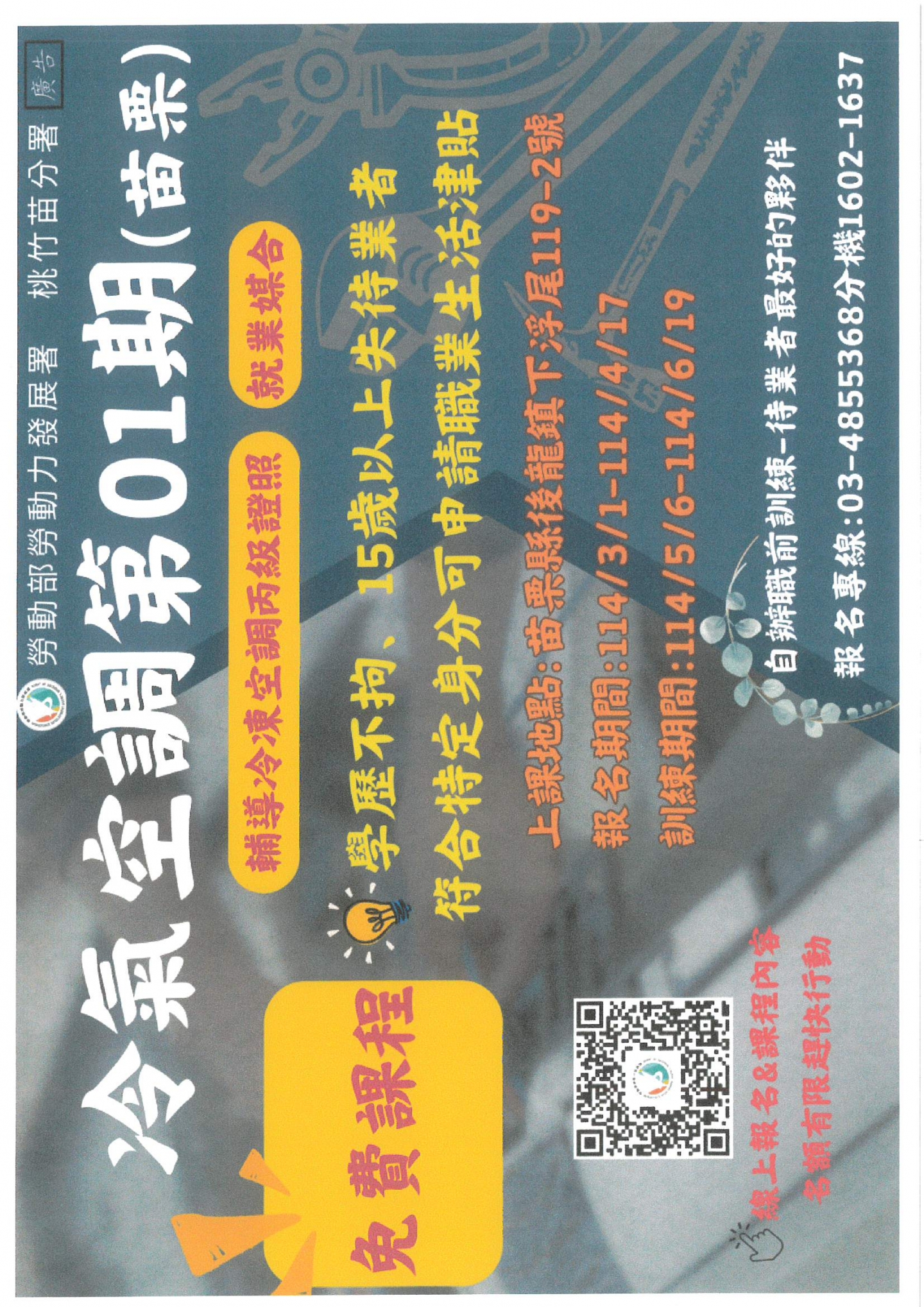 勞動部勞動發展署桃竹苗分署為培訓失待業民眾就業技能,辦理114年度自辦職前訓練「冷凍空調(苗栗)班第01期」歡迎有需求之企業工廠踴躍報名