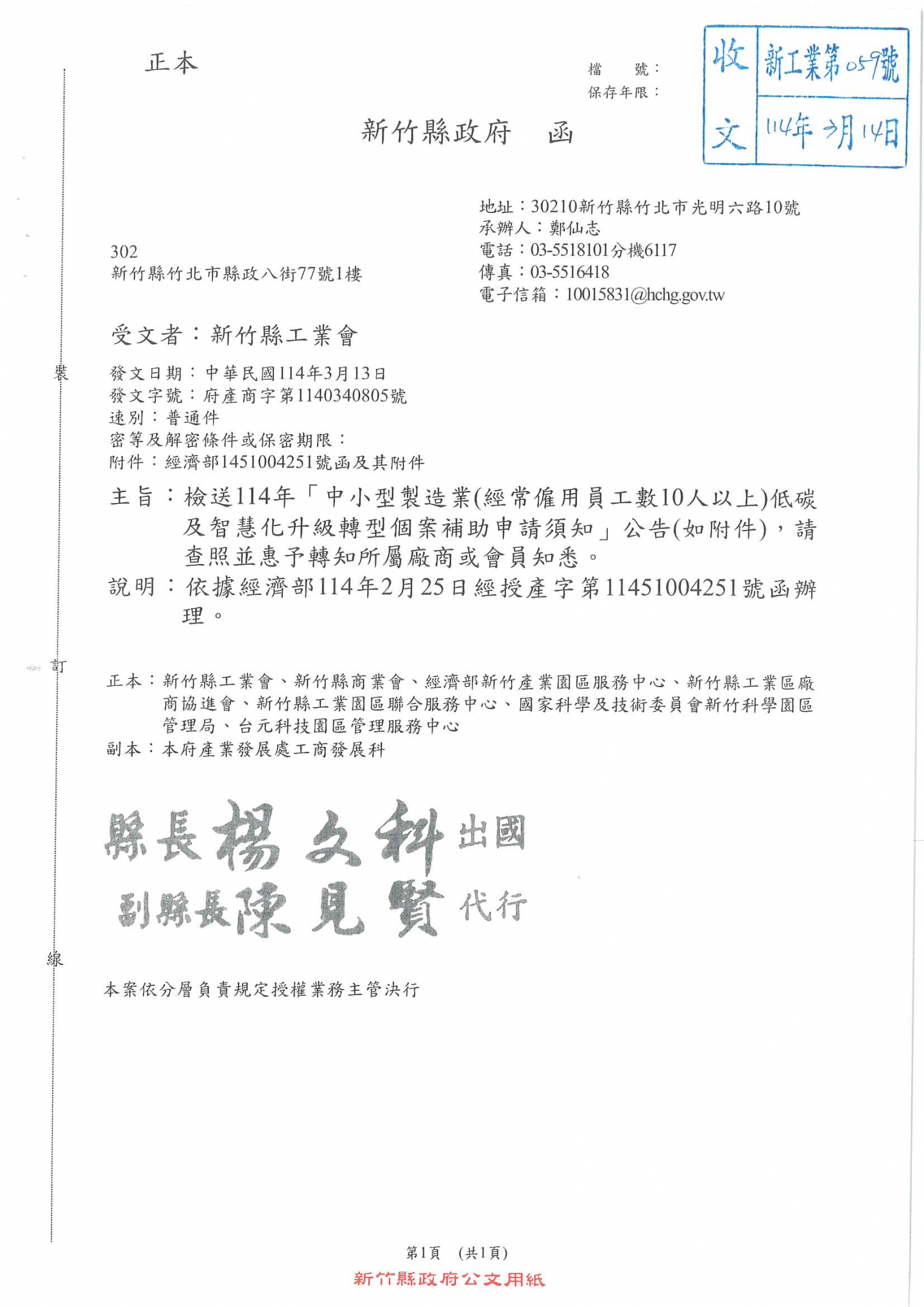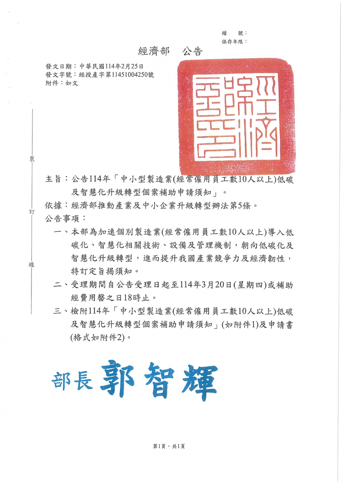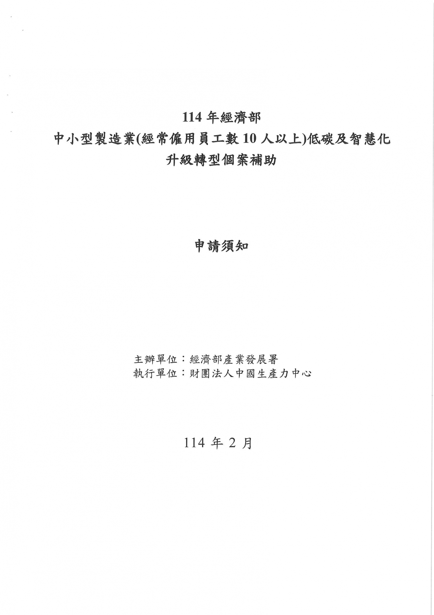經濟部公告114年「中小型製造業(經常雇用員工數10人以上)低碳及智慧化升級轉型個案補助申請須知」歡迎企業單位踴躍參與(更多詳細資訊請洽新竹縣工業會)