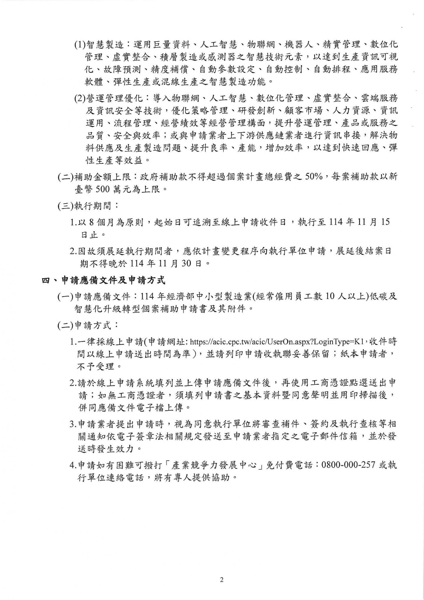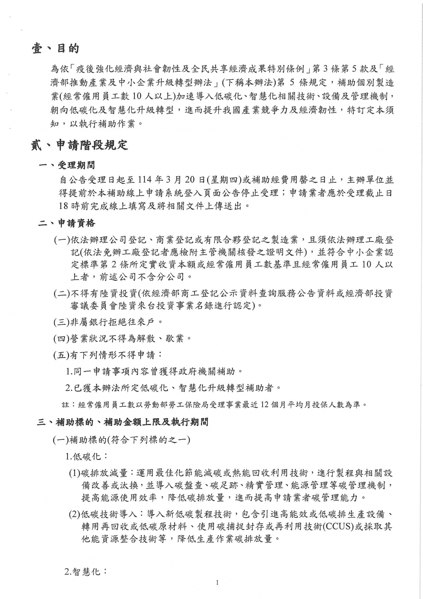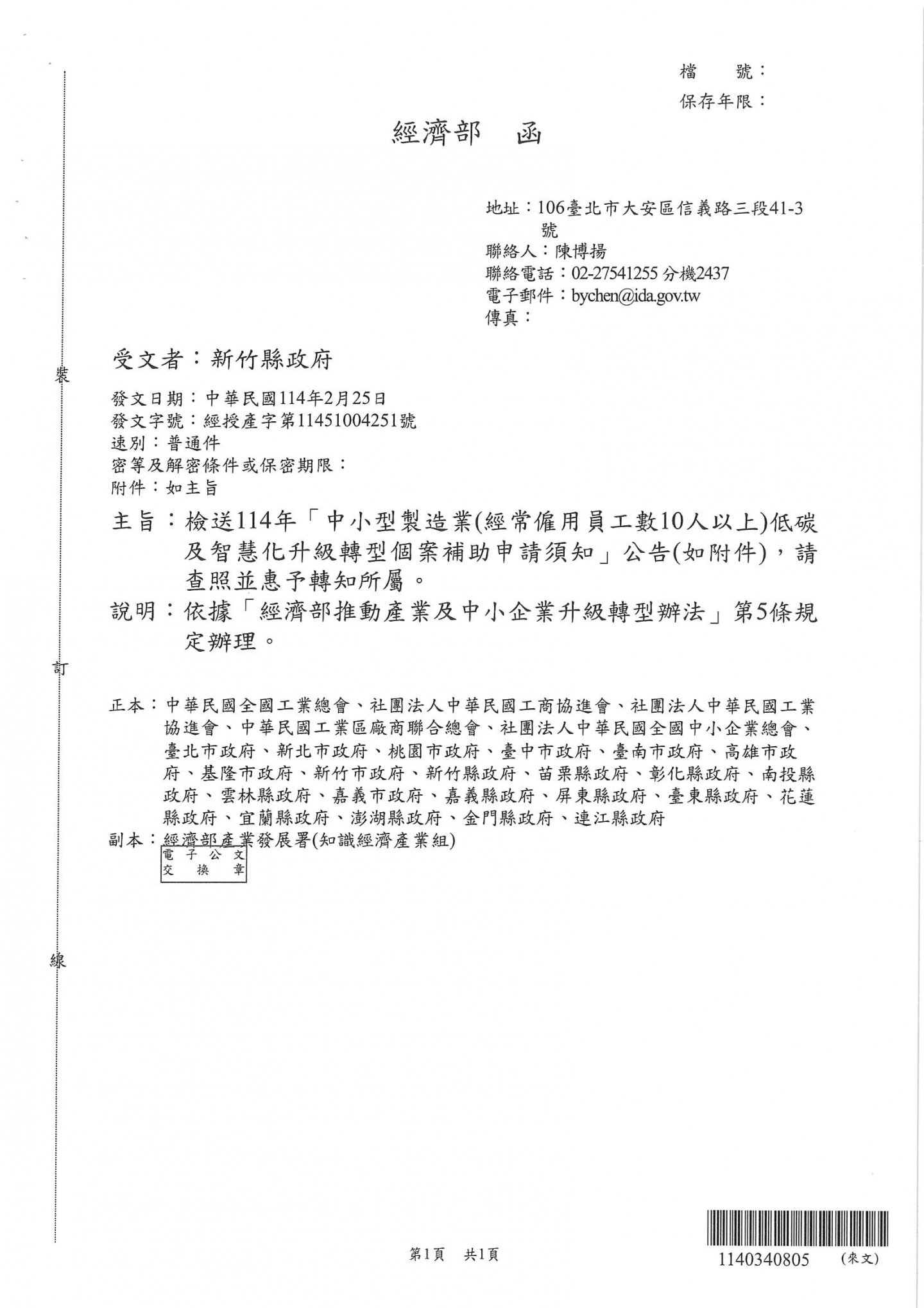 經濟部公告114年「中小型製造業(經常雇用員工數10人以上)低碳及智慧化升級轉型個案補助申請須知」歡迎企業單位踴躍參與(更多詳細資訊請洽新竹縣工業會)