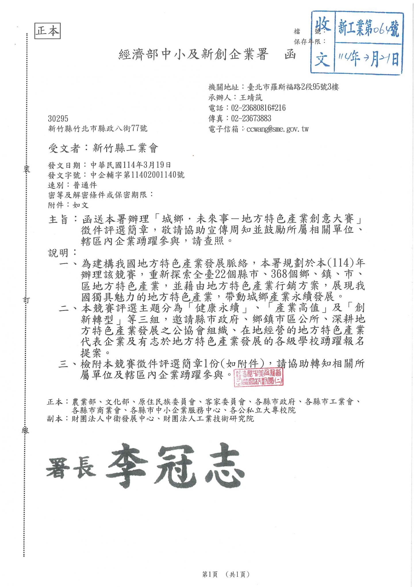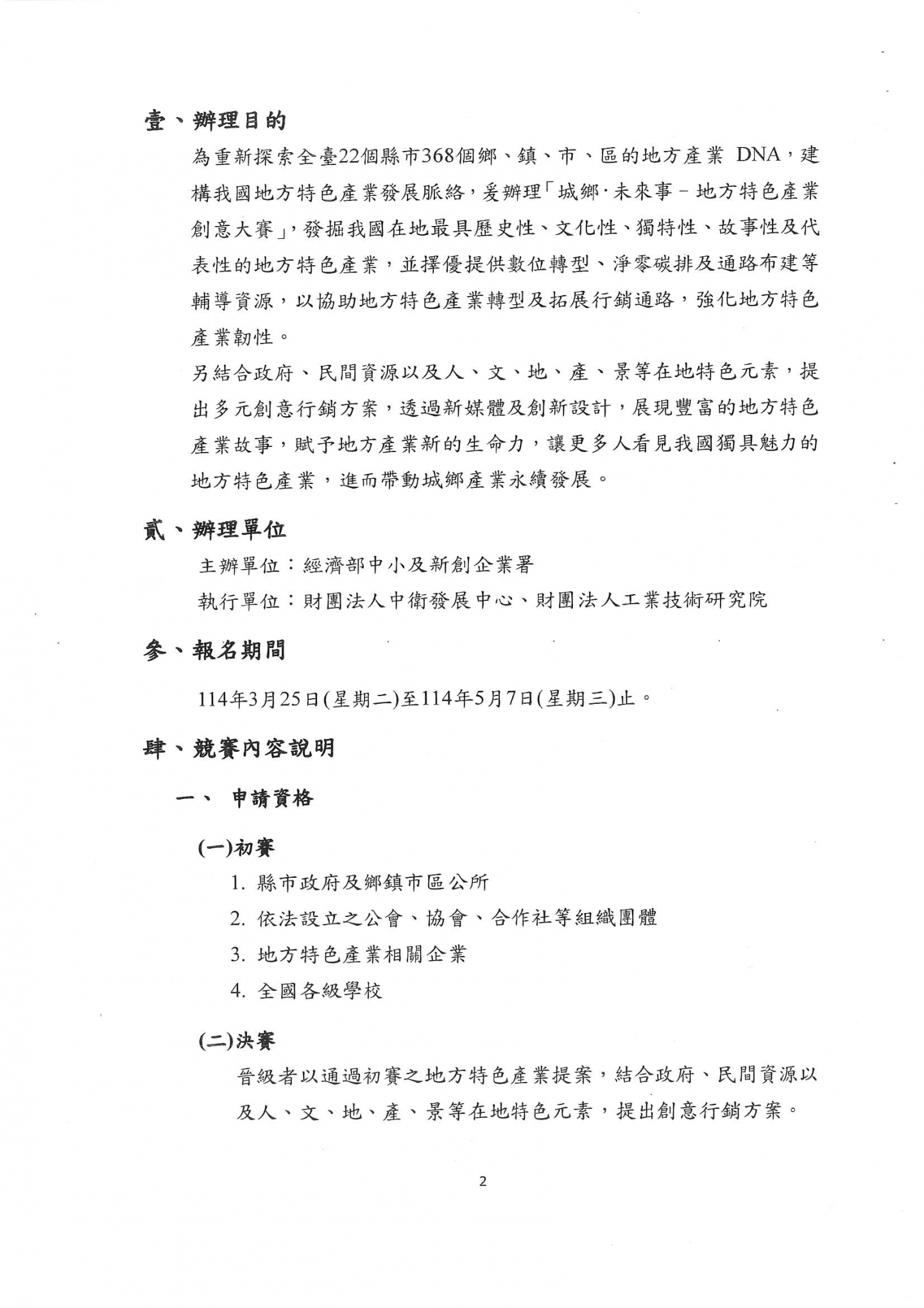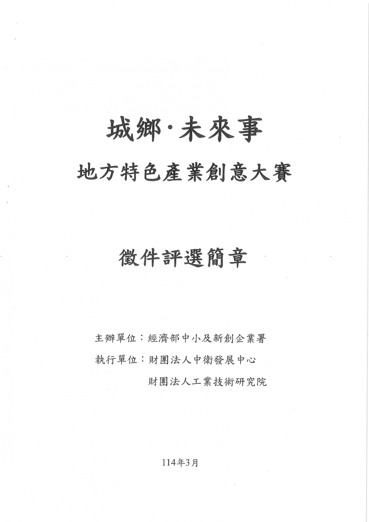 經濟部中小及新創企業署辦理「城鄉.未來事—地方特色產業創意大賽」徵件評選簡章,歡迎相關單位及企業踴躍參與(附件請洽新竹縣工業會)