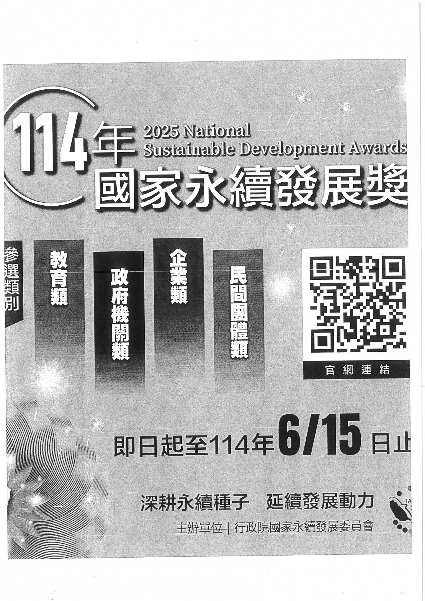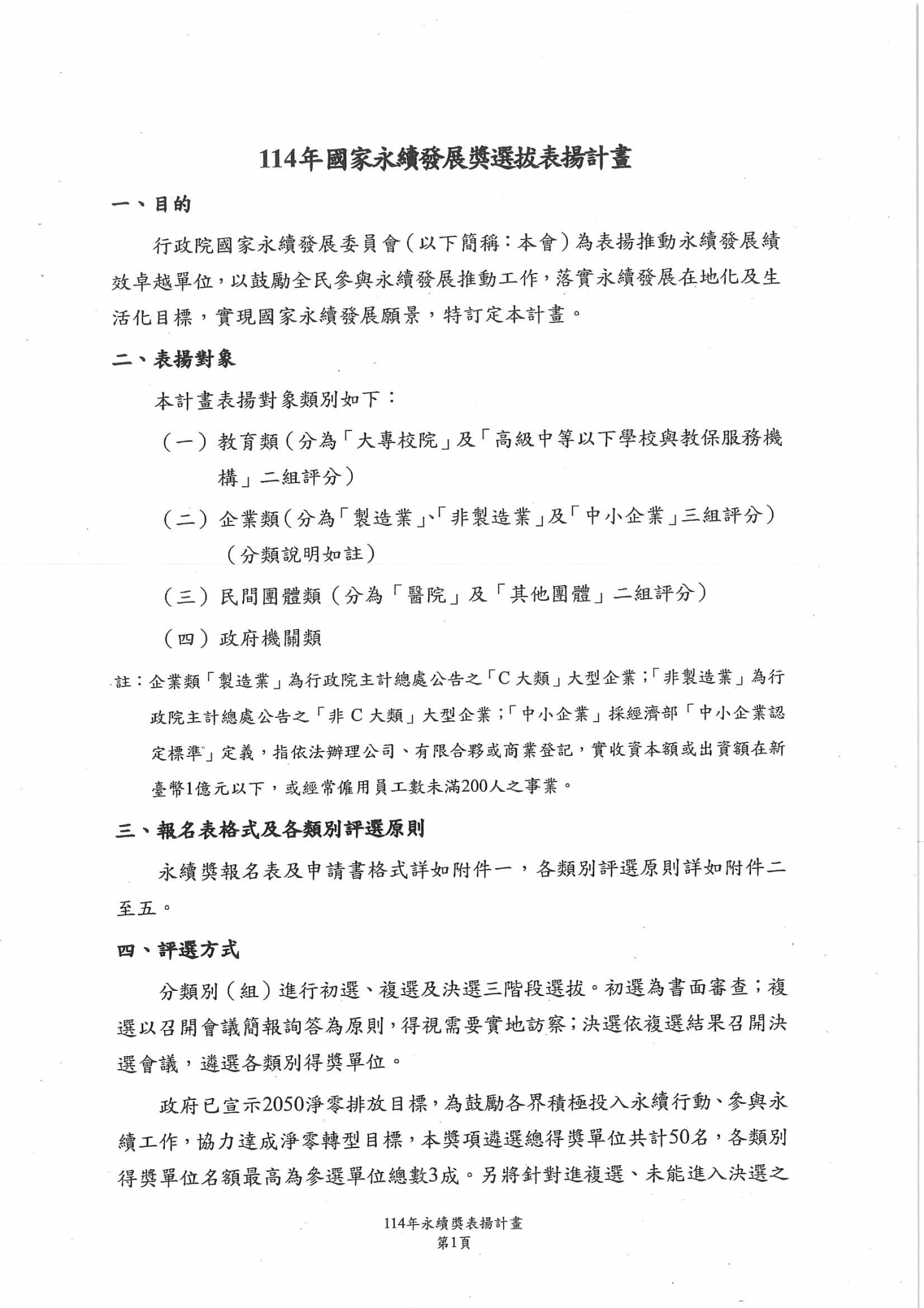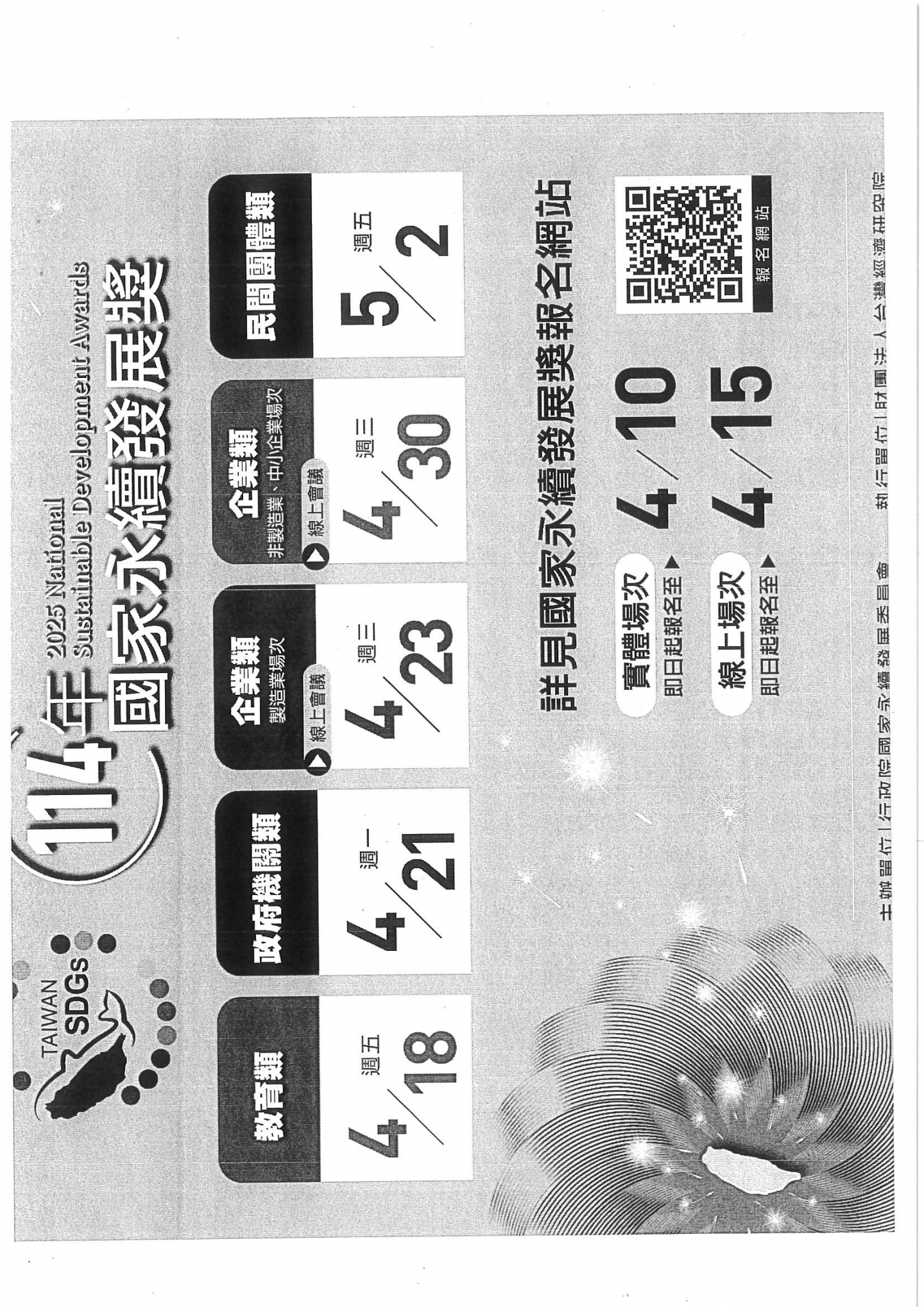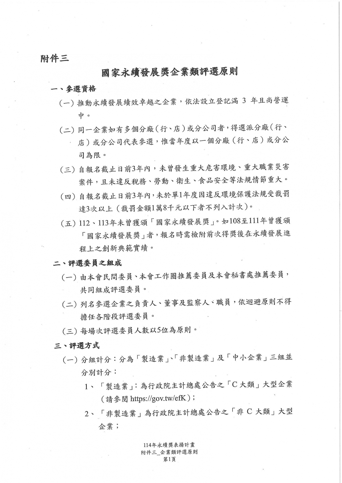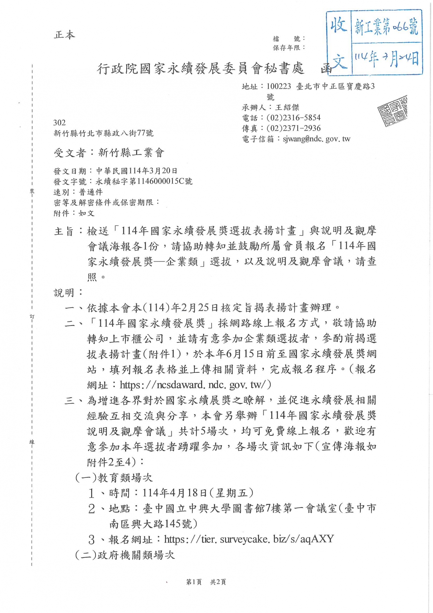 行政院國家永續發展委員會秘書處檢送「114年國家永續發展獎選拔表揚計畫」歡迎各相關企業工廠報名「114年國家永續發展獎—企業類」選拔,以及說明及觀摩會議(完整附件索取請洽新竹縣工業會)