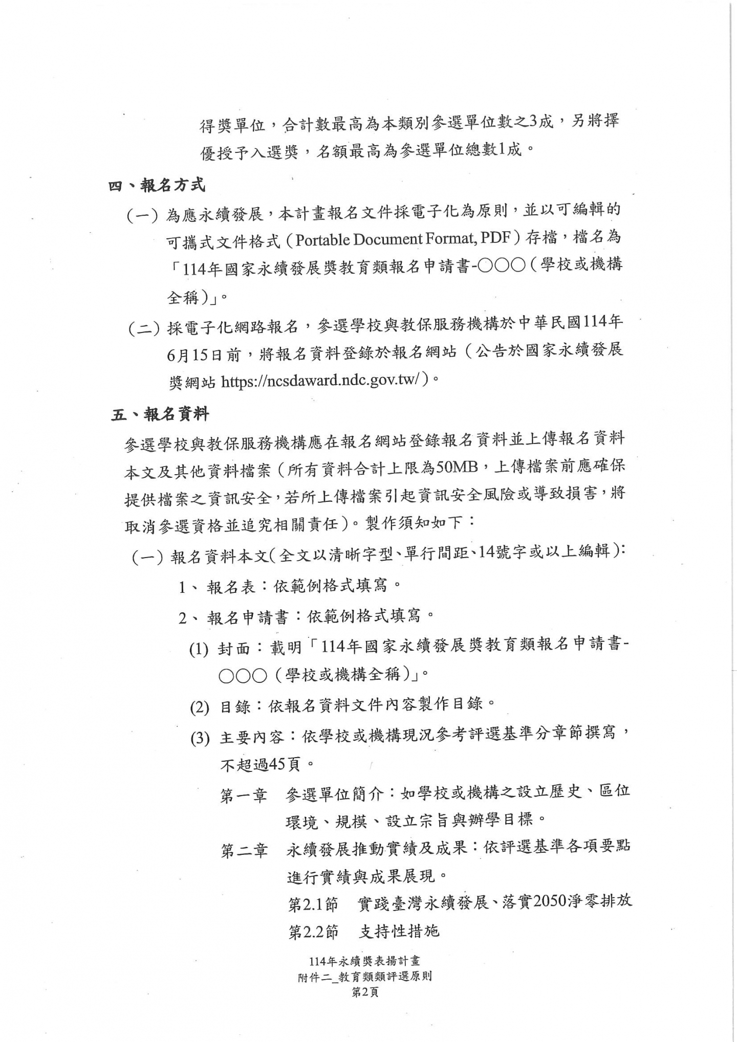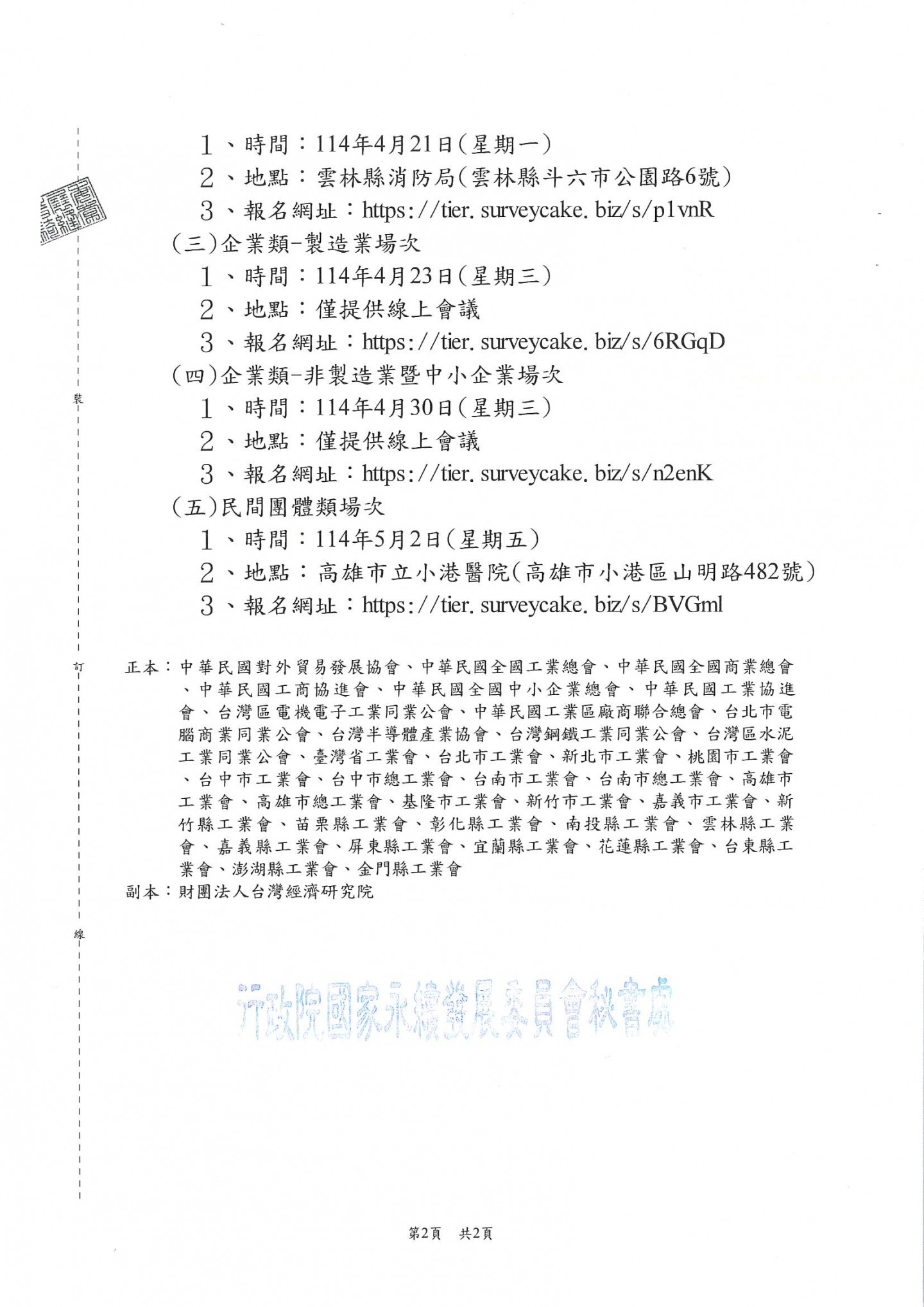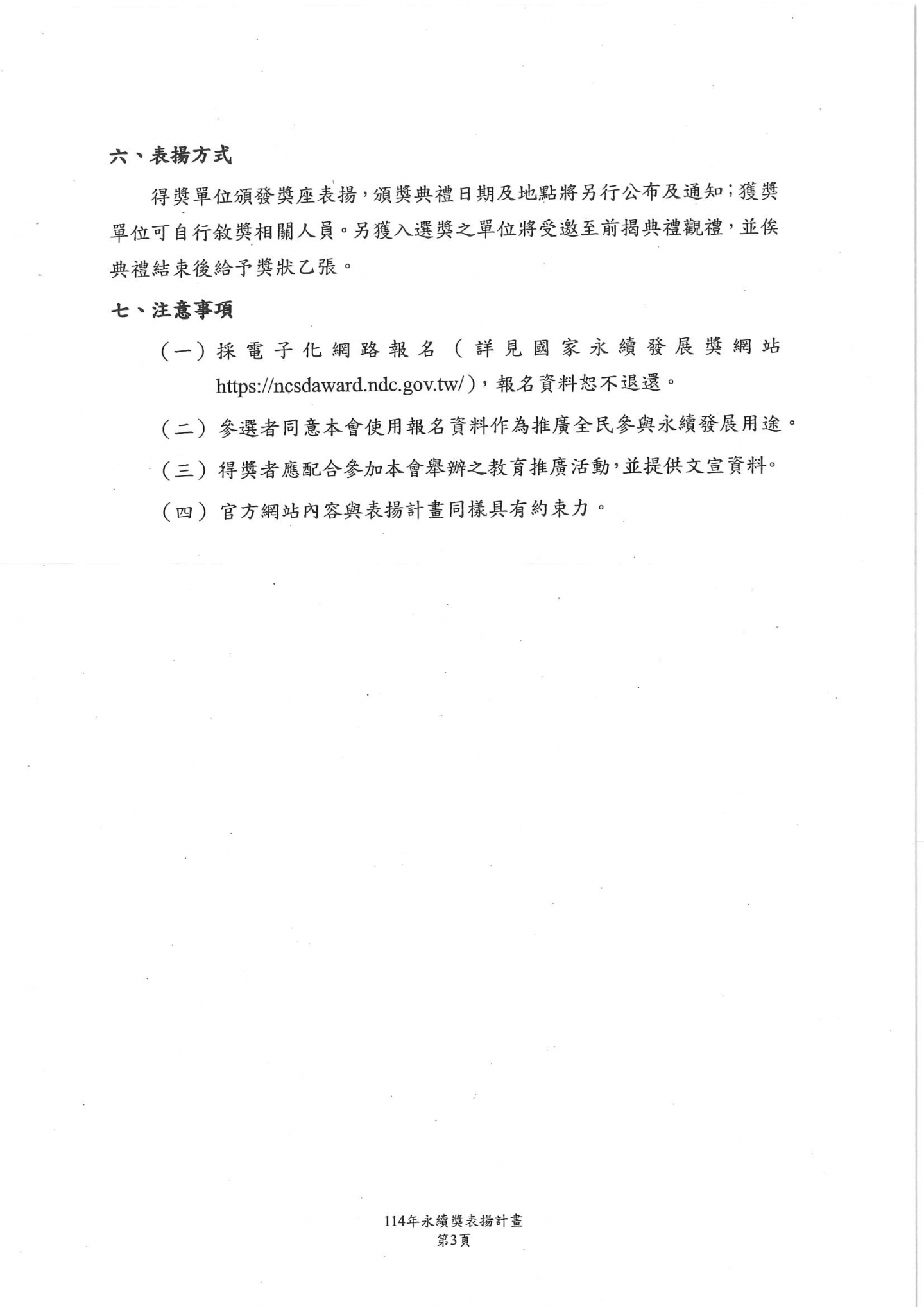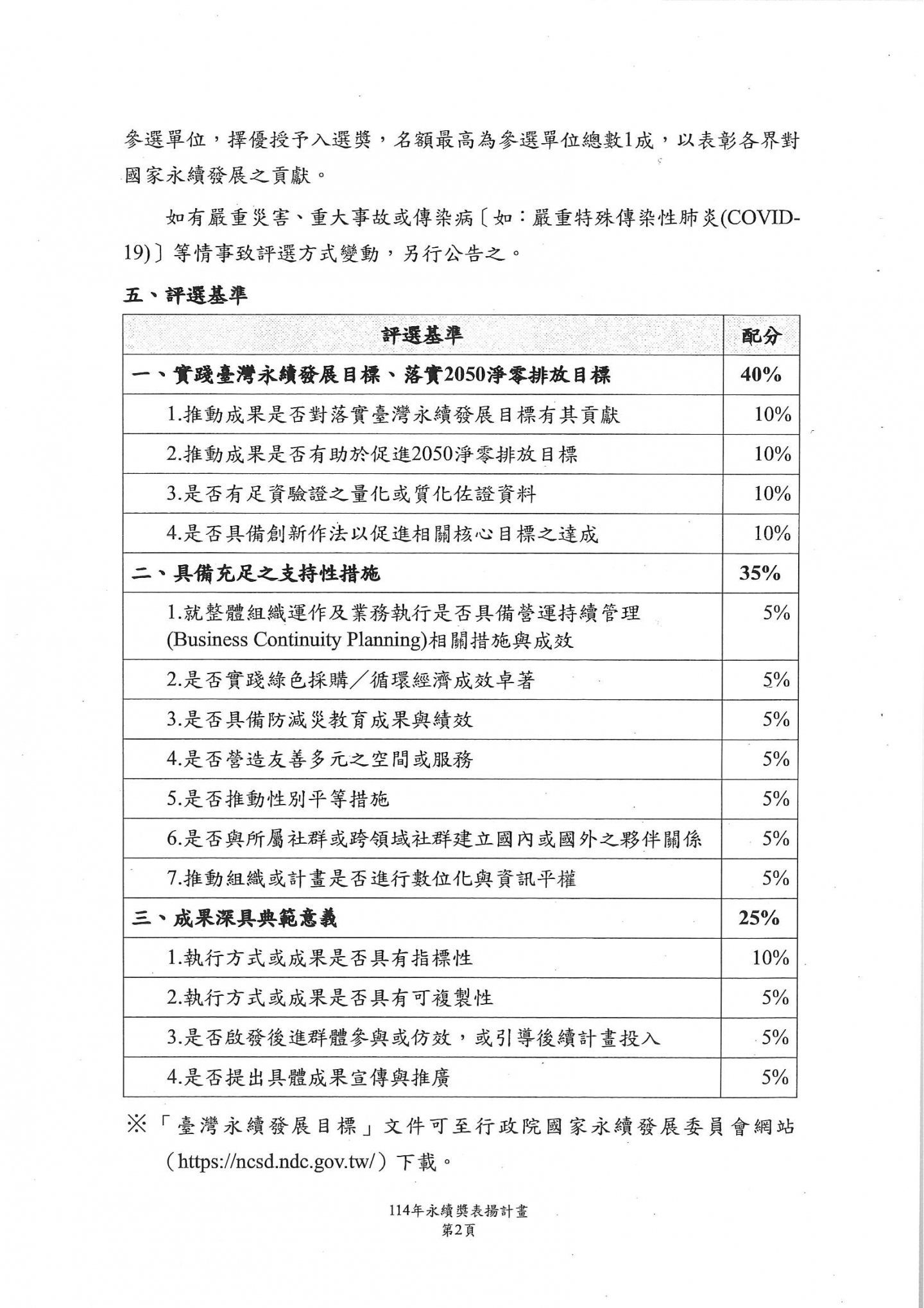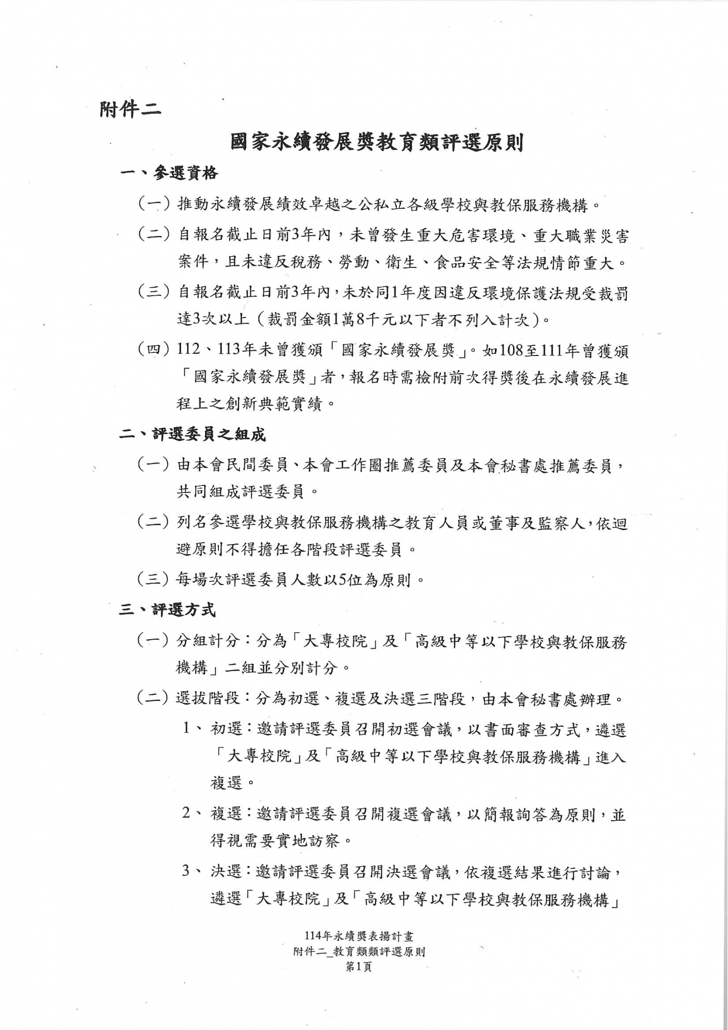 行政院國家永續發展委員會秘書處檢送「114年國家永續發展獎選拔表揚計畫」歡迎各相關企業工廠報名「114年國家永續發展獎—企業類」選拔,以及說明及觀摩會議(完整附件索取請洽新竹縣工業會)