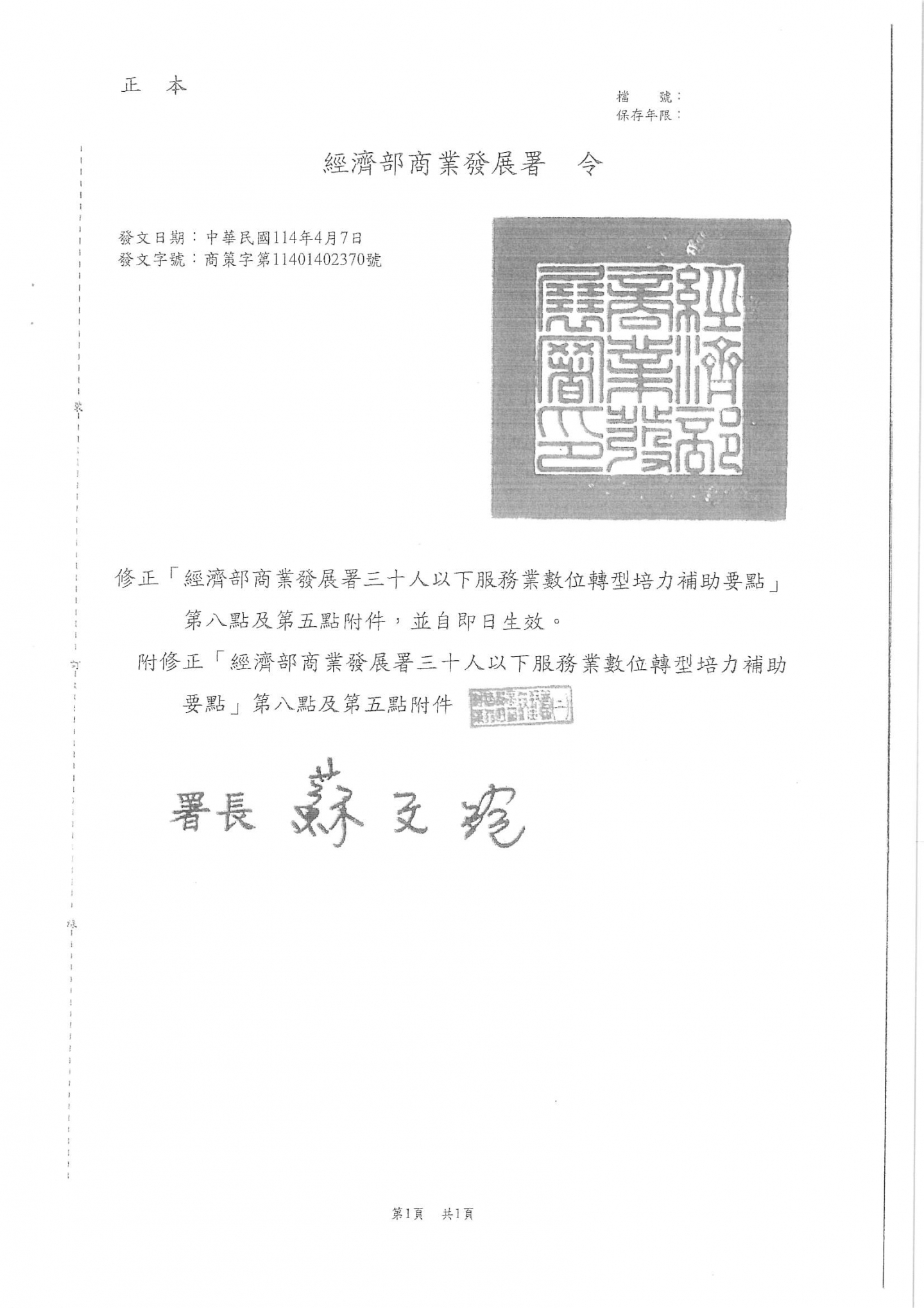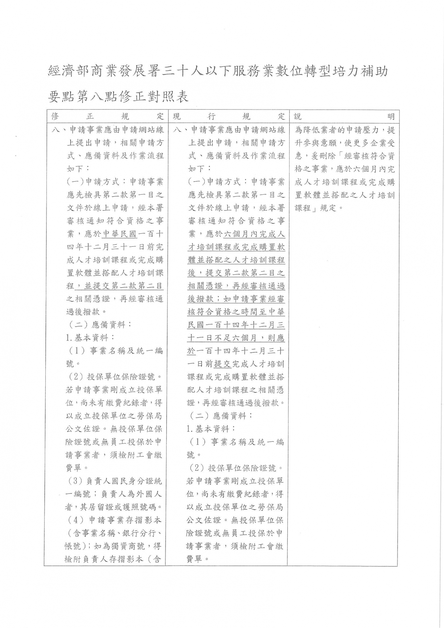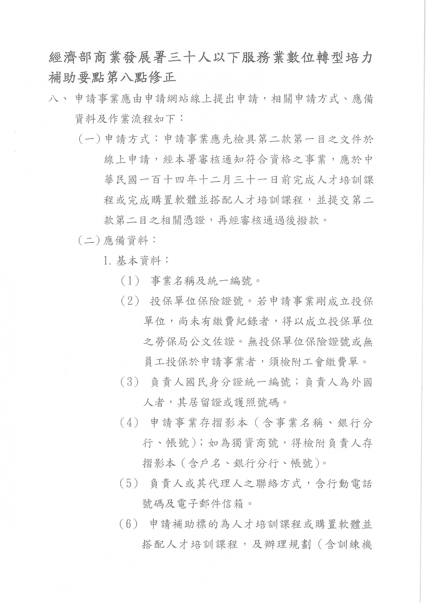 經濟部商業發展署修正「經濟部商業發展署三十人以下服務業數位轉型培力補助要點」第8項及第5點附件,並自即日生效
