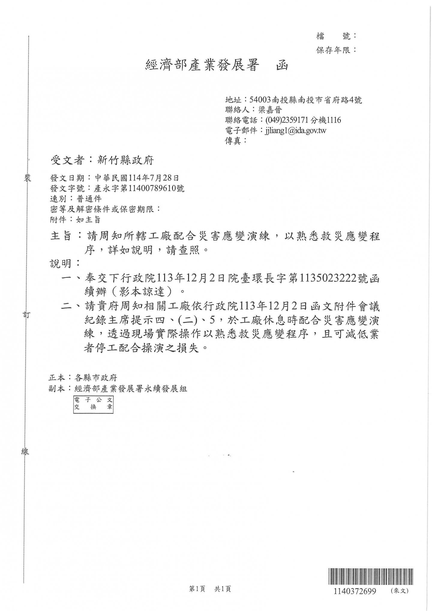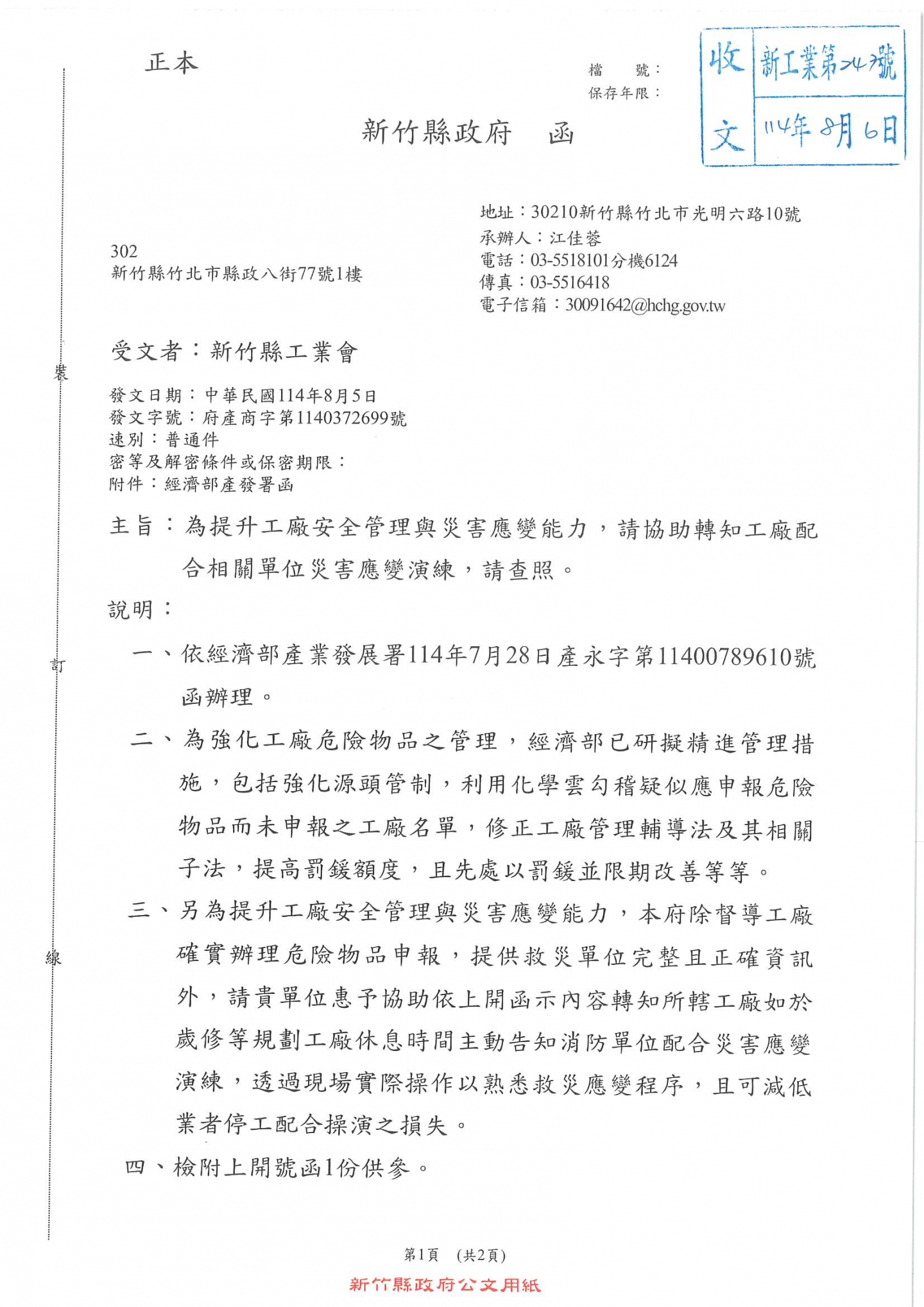 經濟部產業發展屬說明「請新竹縣內工廠配合災害應變演練,以熟悉救災應變程序」