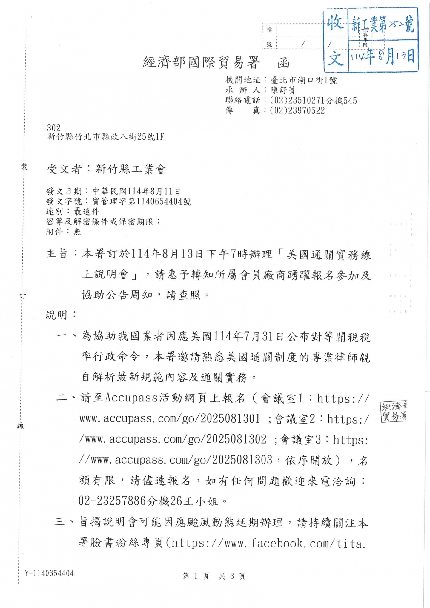 經濟部國際貿易署訂於114年8月13日下午7時辦理「美國通關實務線上說明會」邀請所有企業廠商踴躍報名參加