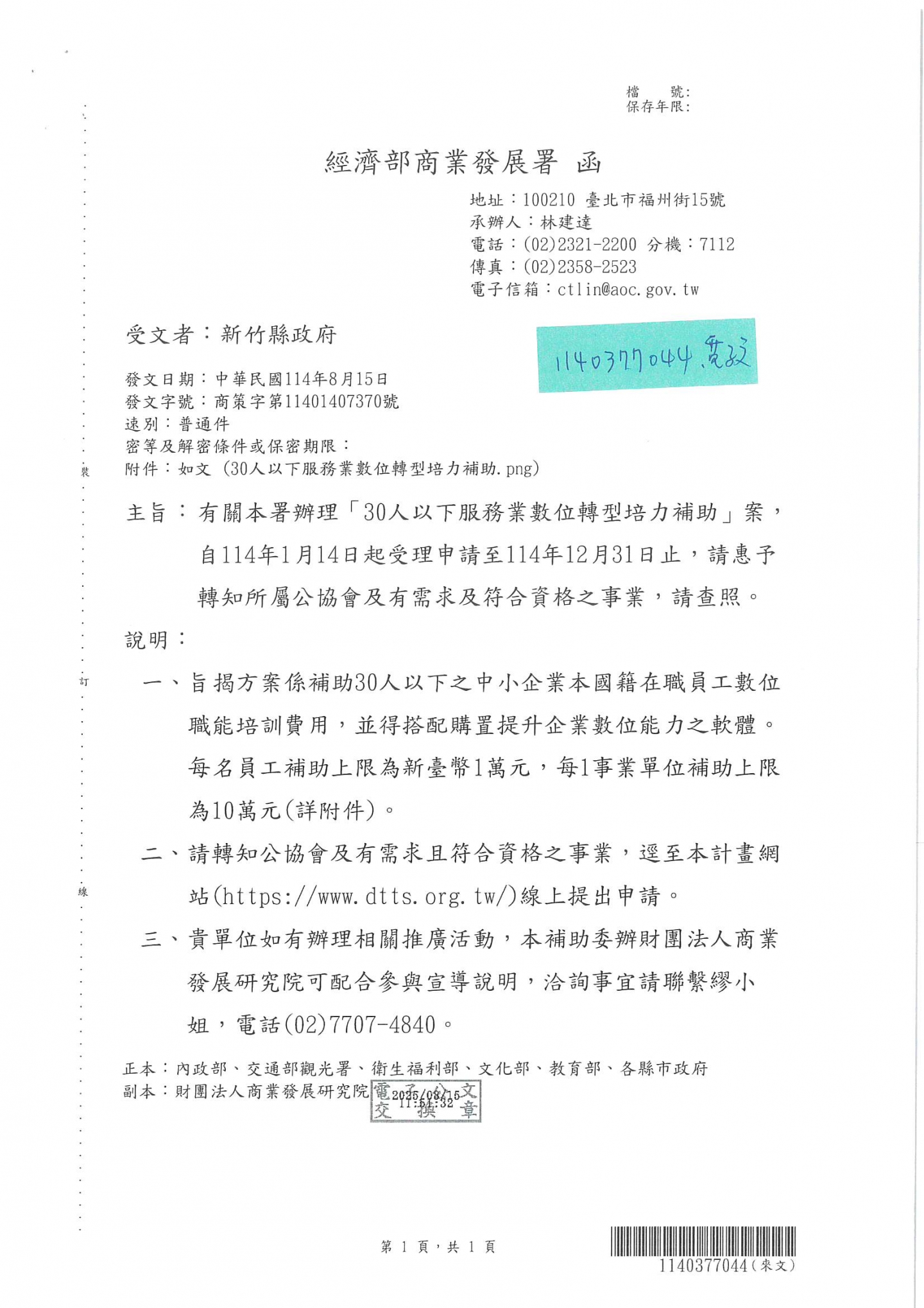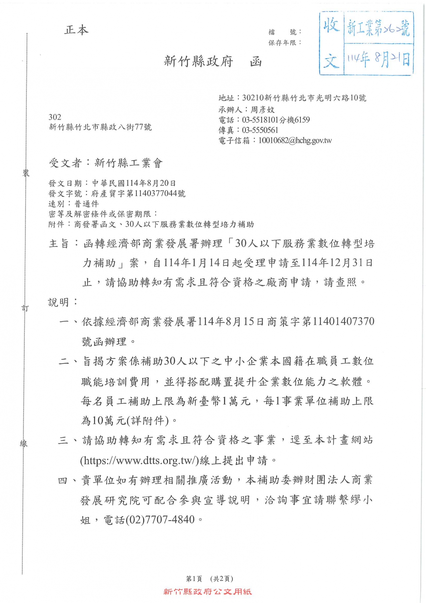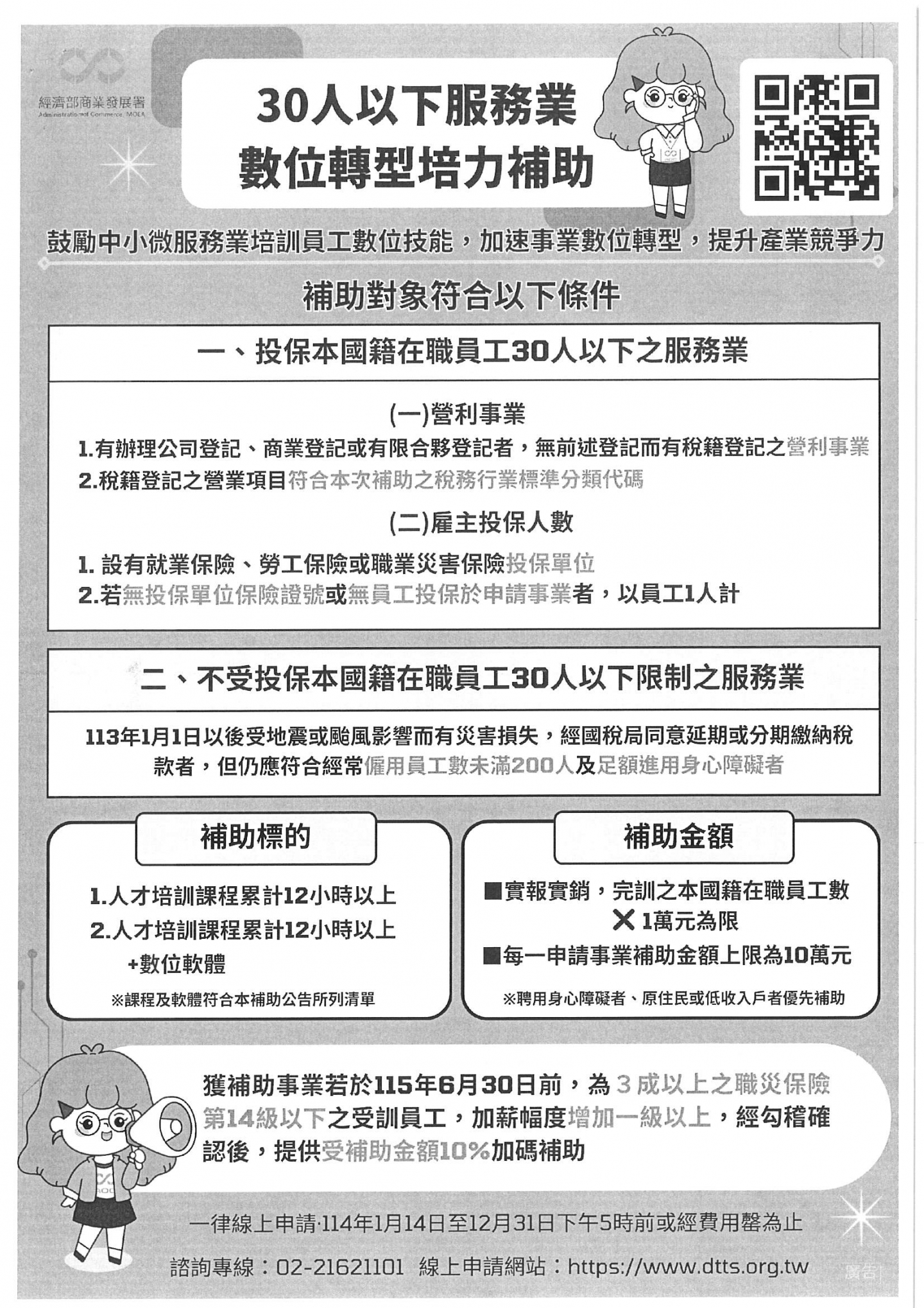 經濟部商業發展署辦理「30人以下服務業數位轉型培 力補助」計畫,自114年1月14日起受理申請至114年12月31日止,歡迎符合資格之廠商申請