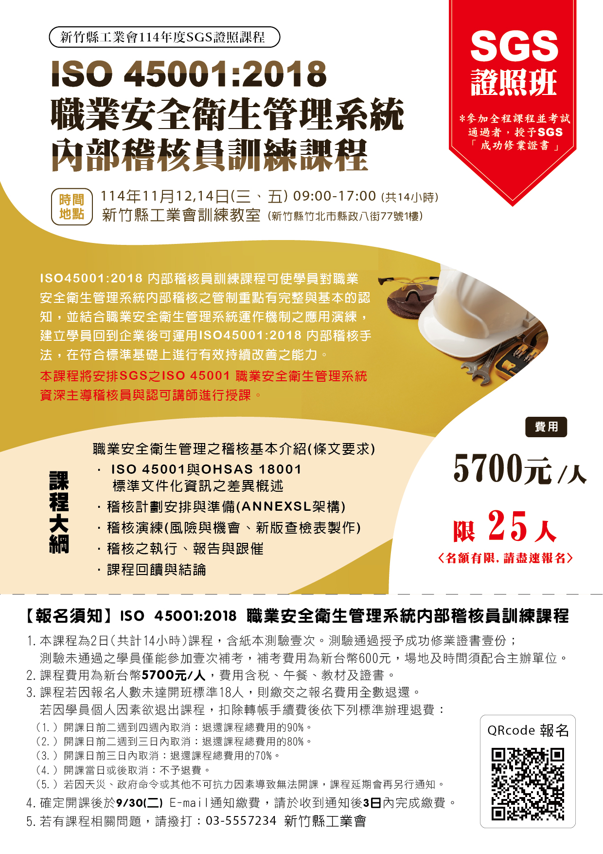 【SGS證照班】114/11/12.14 (三、五) ISO 45001:2018 職業安全衛生管理系統 內部稽核員訓練課程