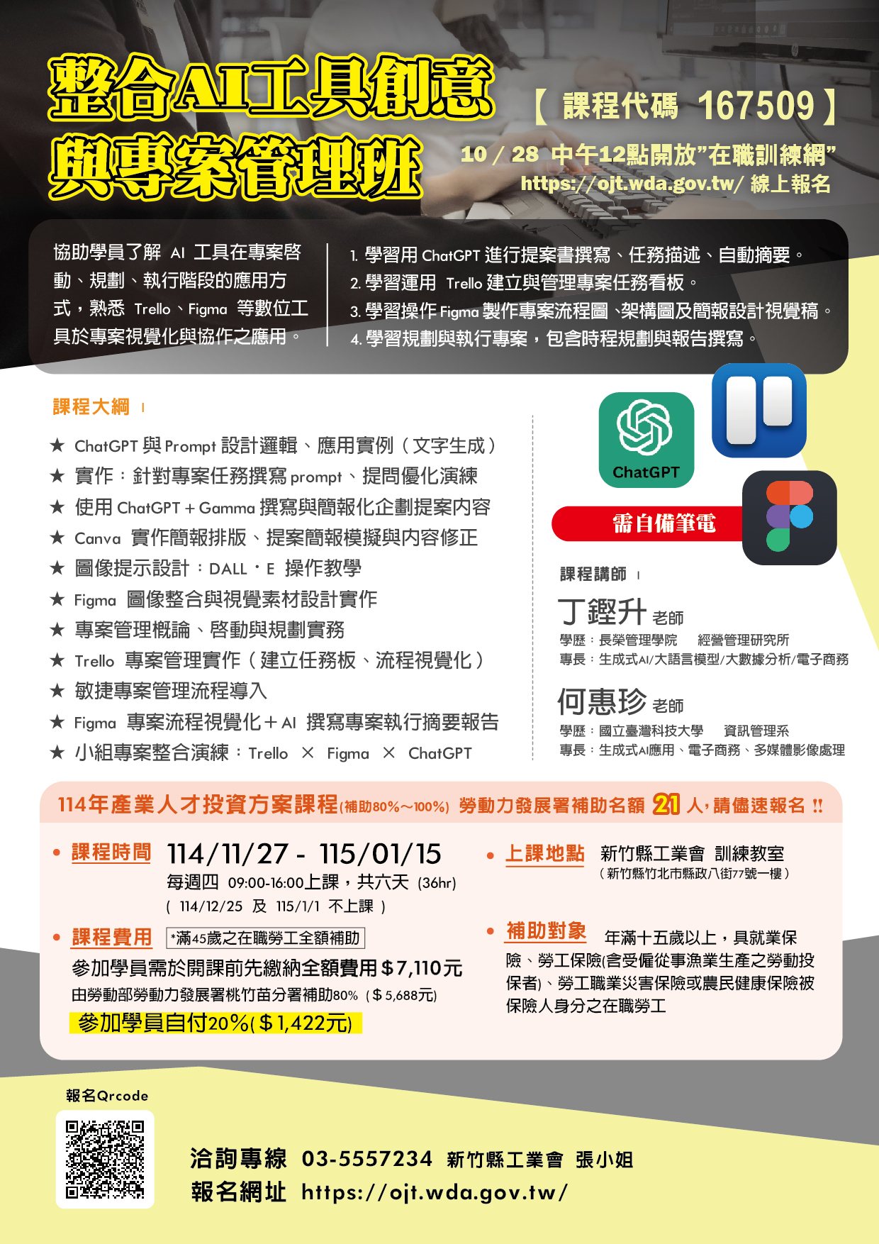 【補助80%-100%】114/11/27 - 115/01/15 整合AI工具創意與專案管理班-第1期