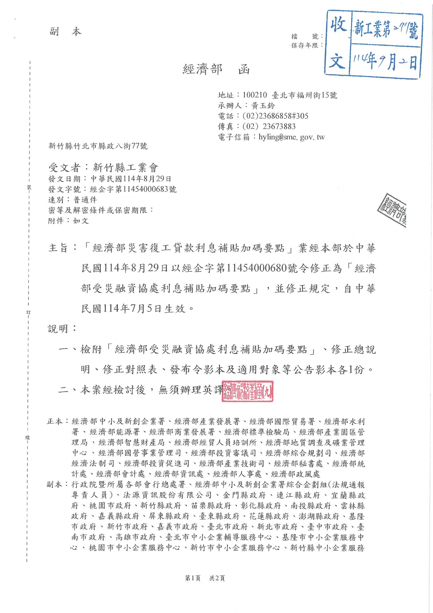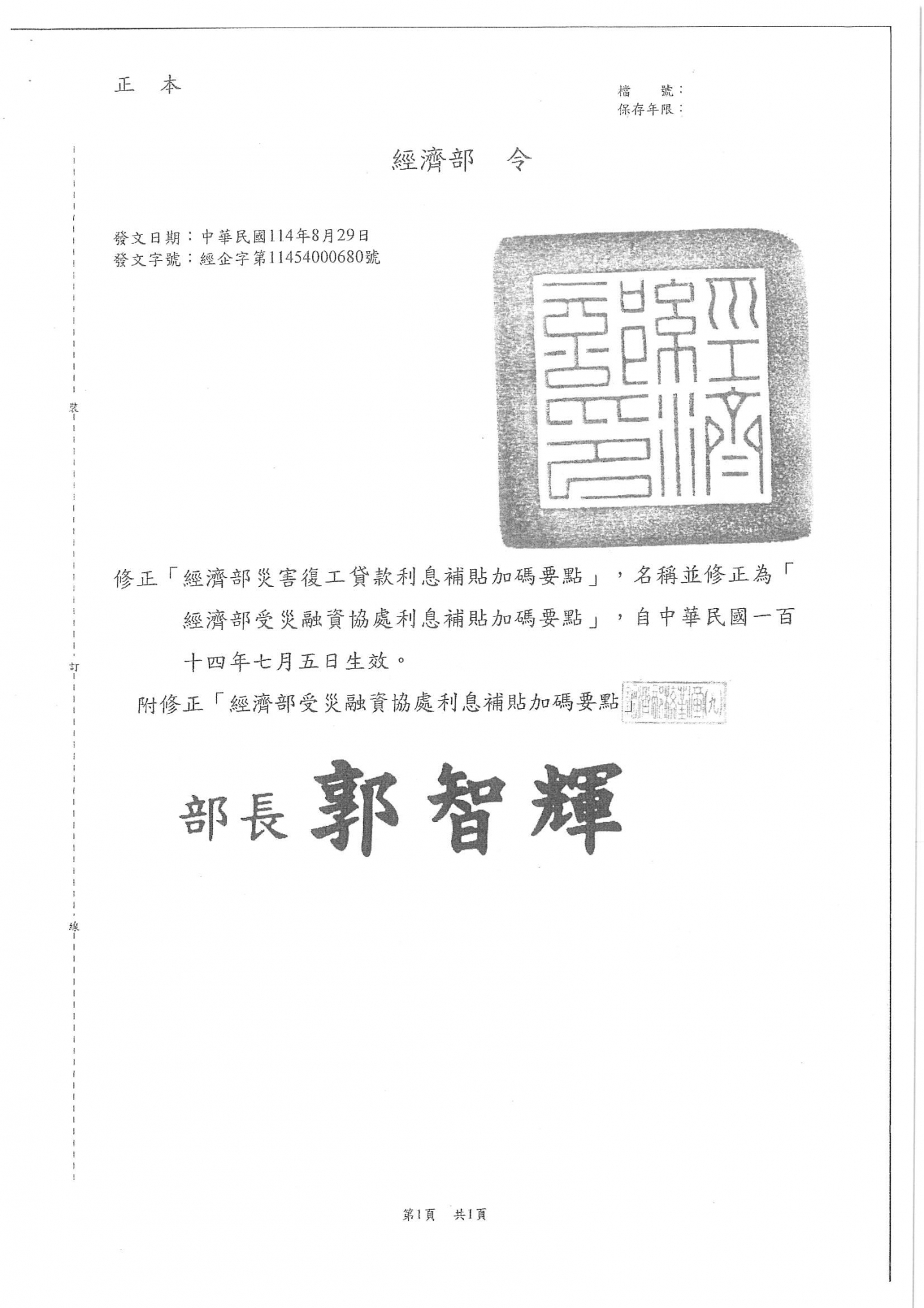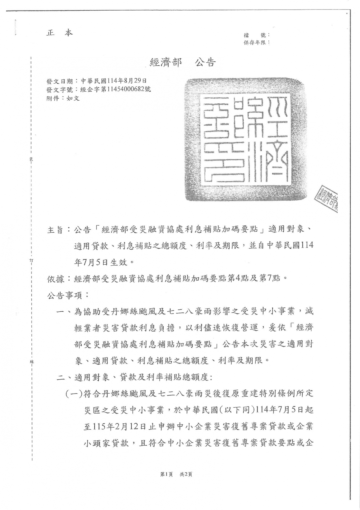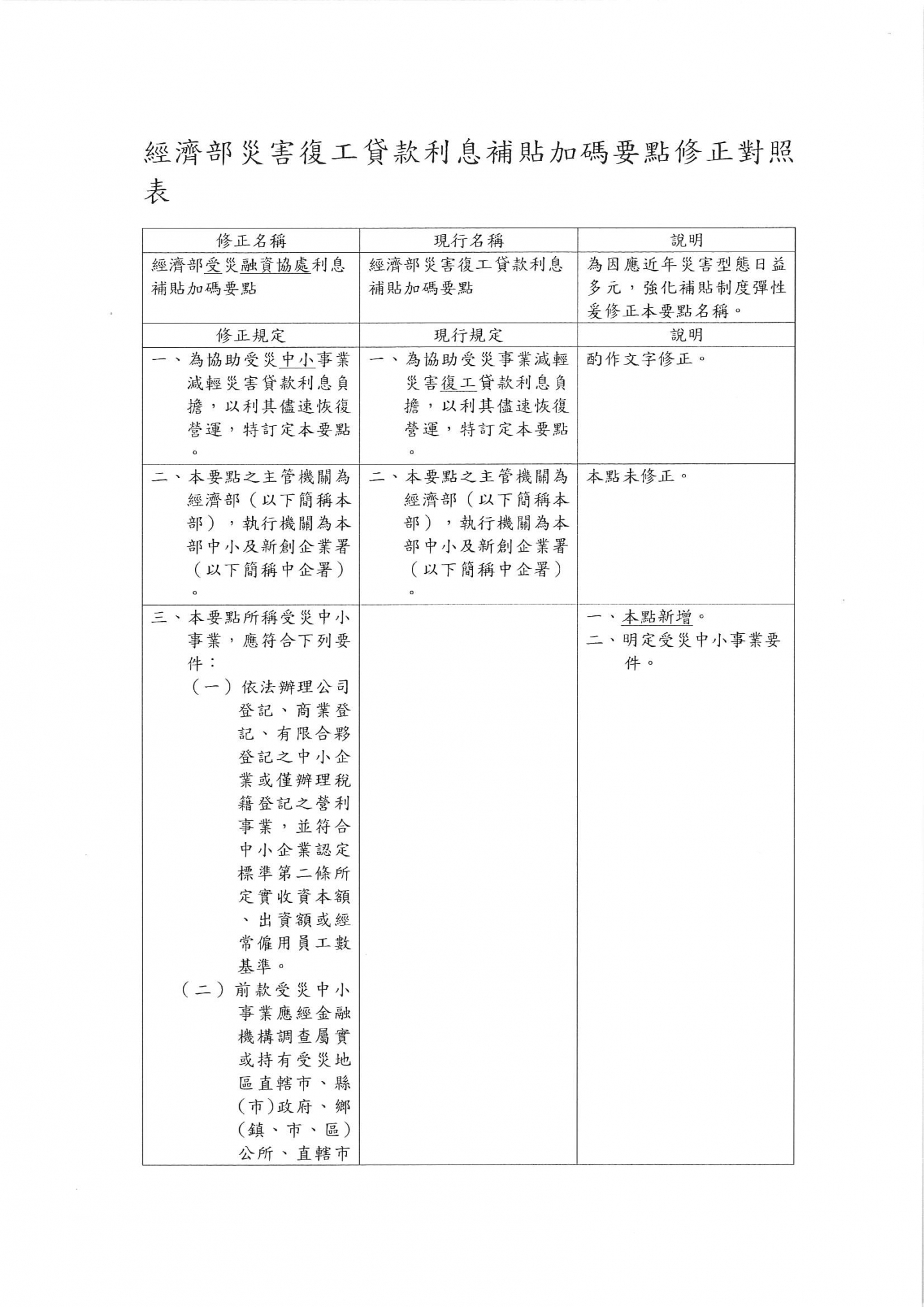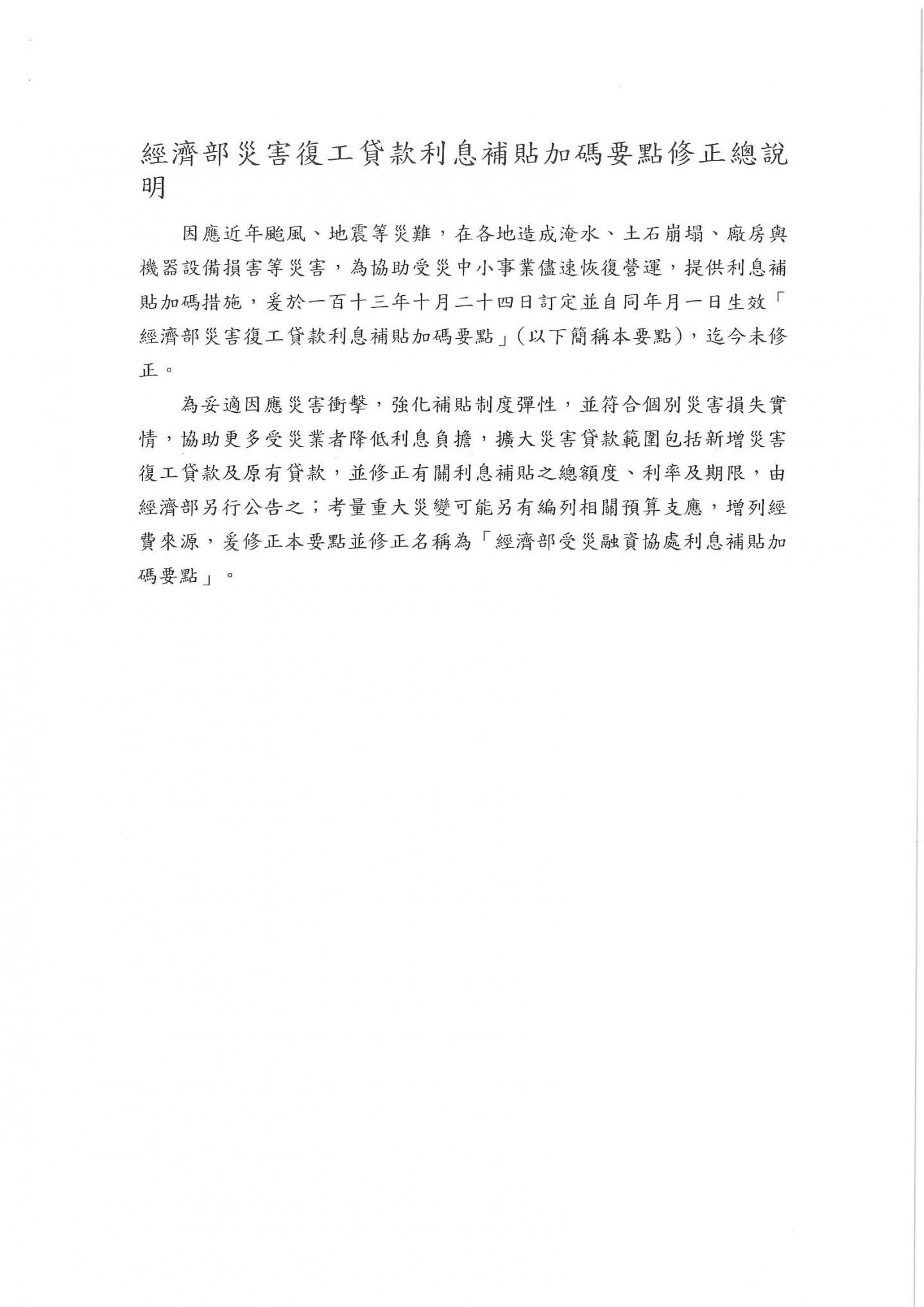 經濟部於中華民國114年8月29日修正「經濟部災害復工貸款利息補貼加碼要點」以經企字第114540000680號令修正為「經濟部受災融資協處利息補貼加碼要點」,並修正規定,自中華民國114年7月5日生效