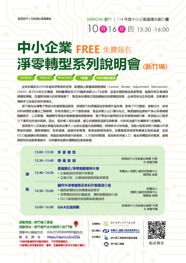 【免費說明會】114/10/16(四) 13:30-16:00 中小企業淨零轉型系列說明會(新竹場)