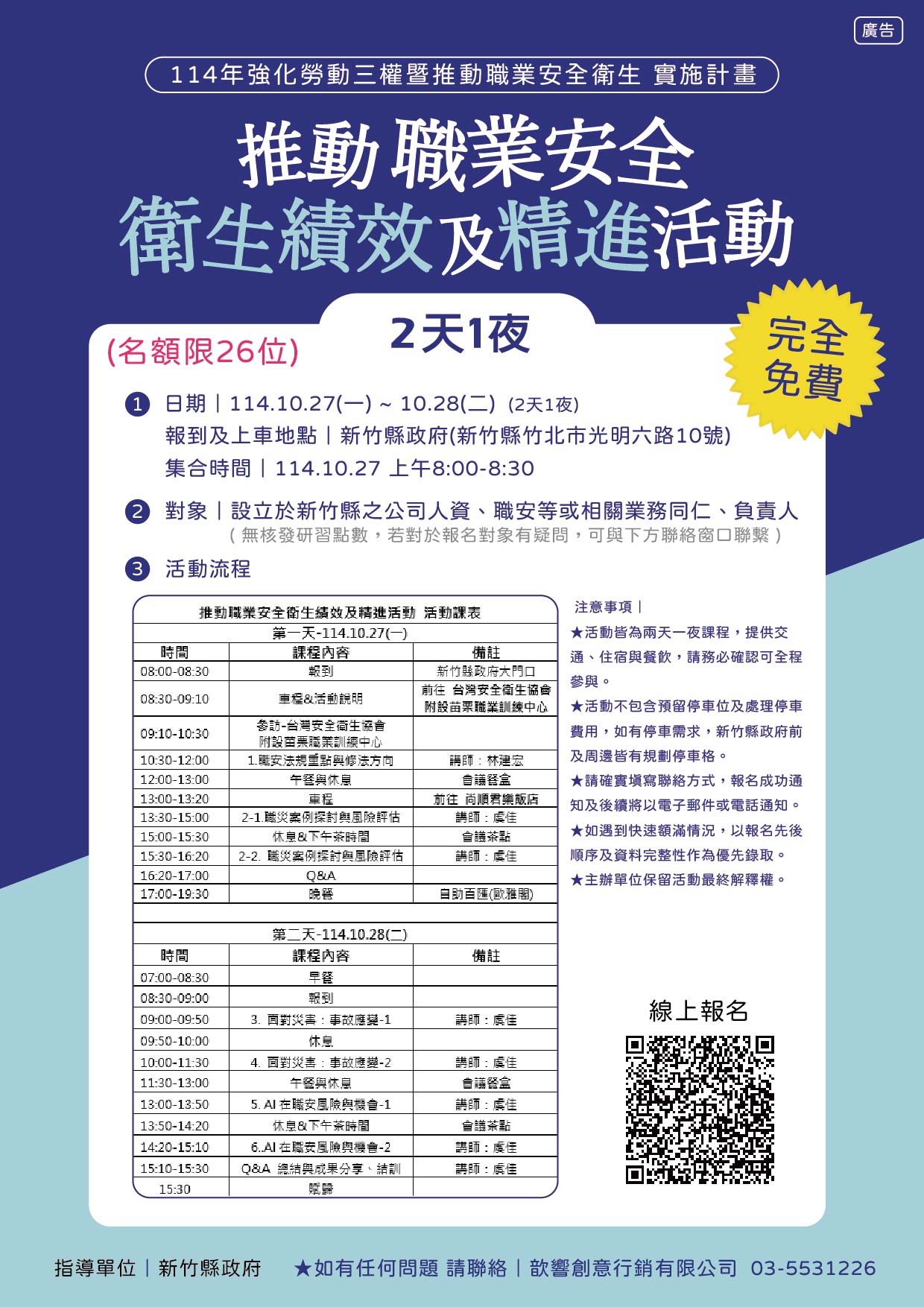 114/10/27 ~ 28 (一~二) 新竹縣政府 114年『推動職業安全衛生績效及精進活動』兩天一夜