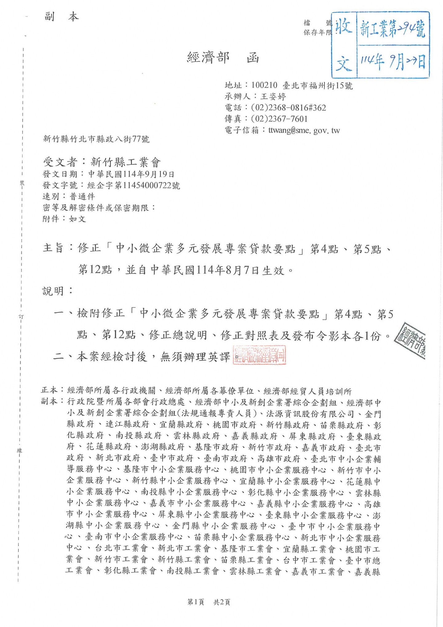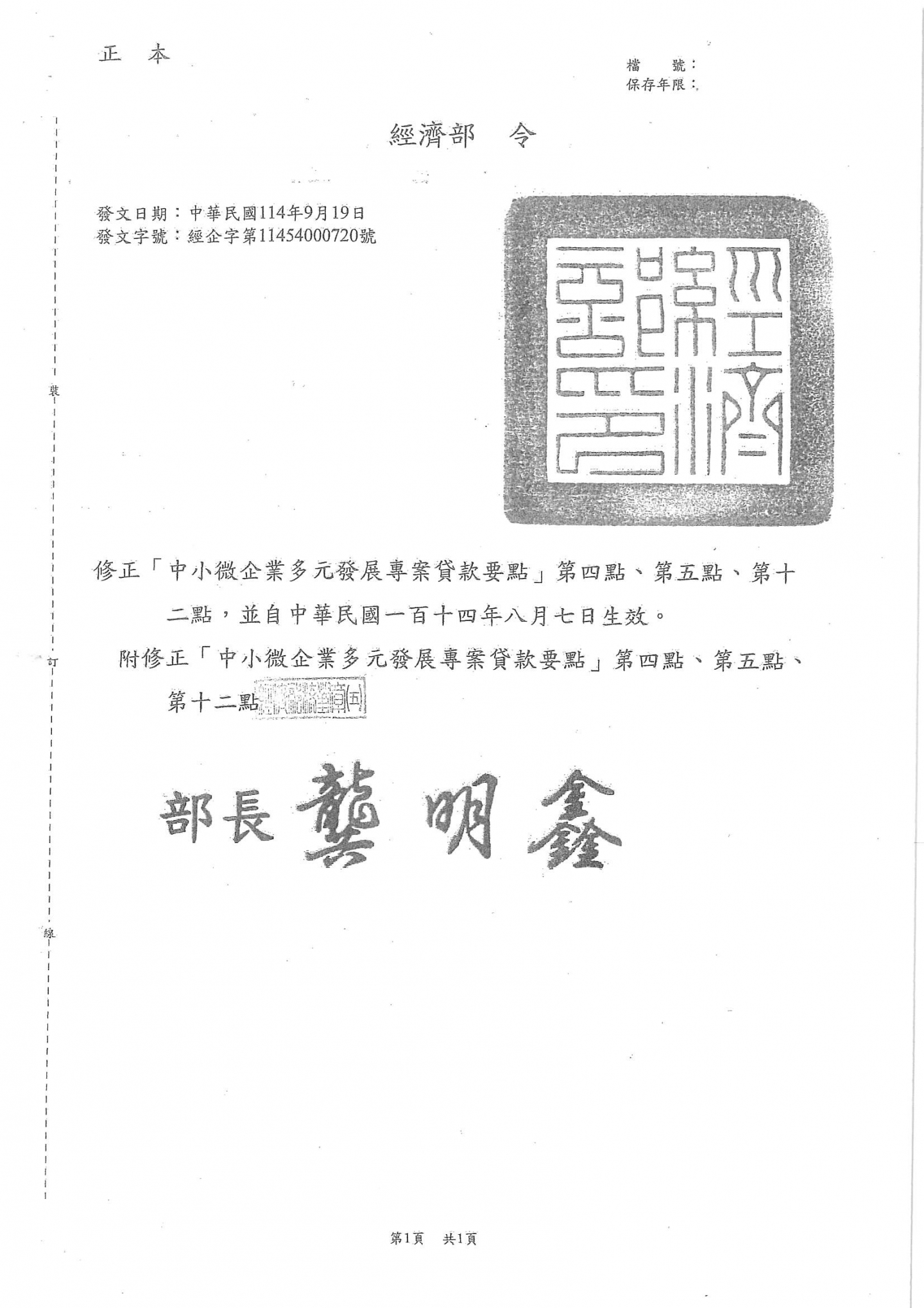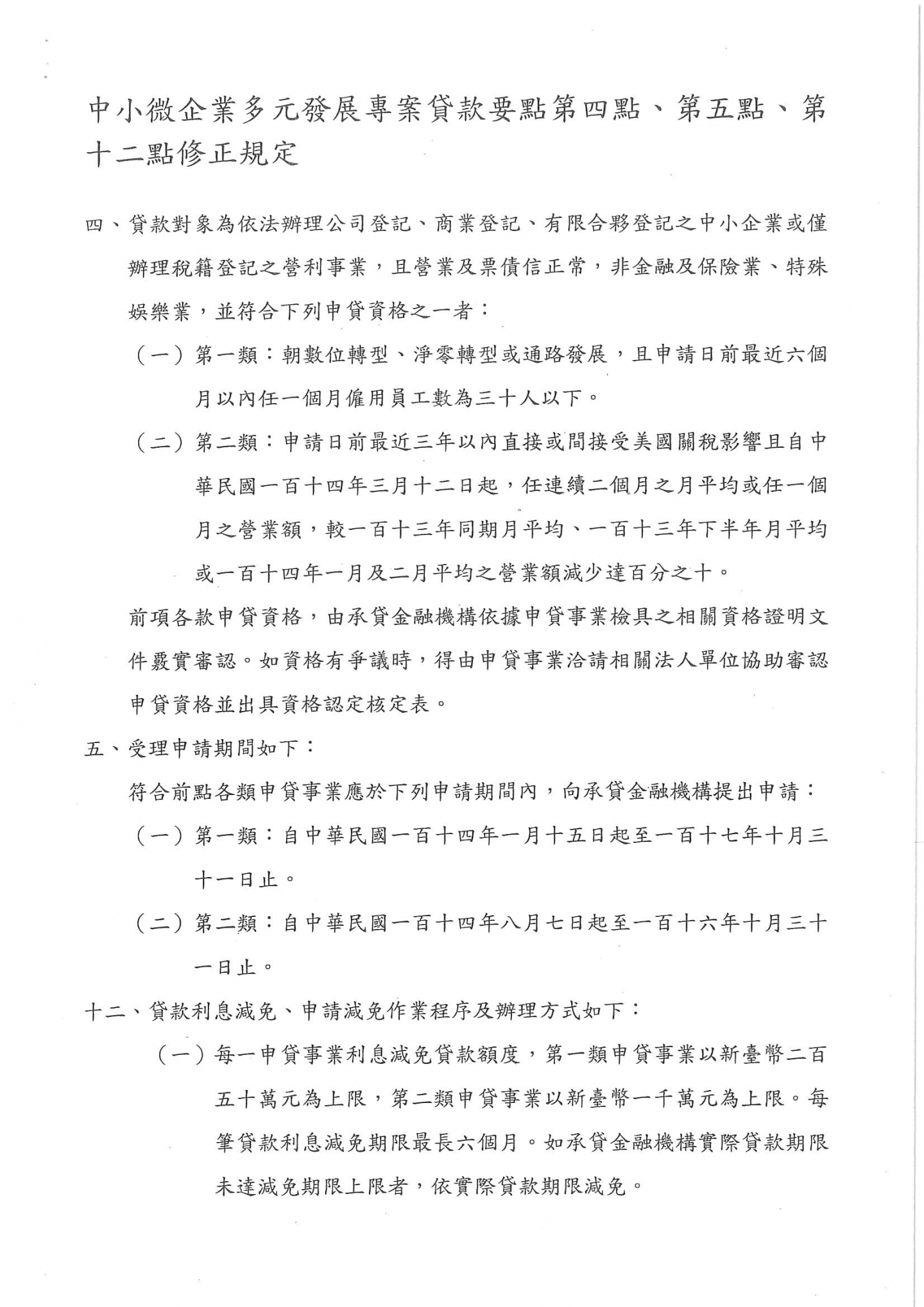 經濟部修正「中小微企業多元發展專案貸款要點」第4點、第5點、 第12點,並自中華民國114年8月7日生效。請欲申請之企業單位多加留意