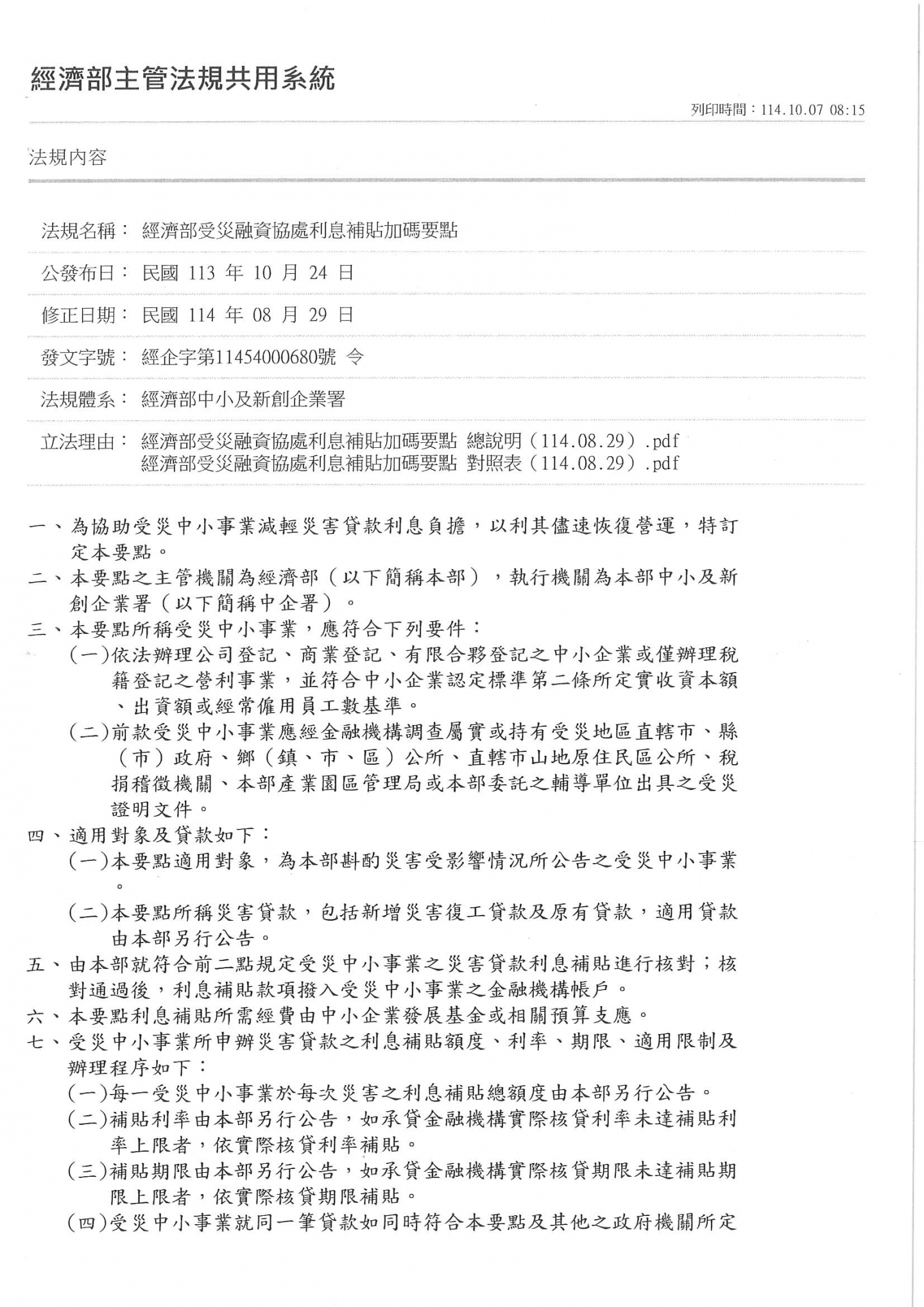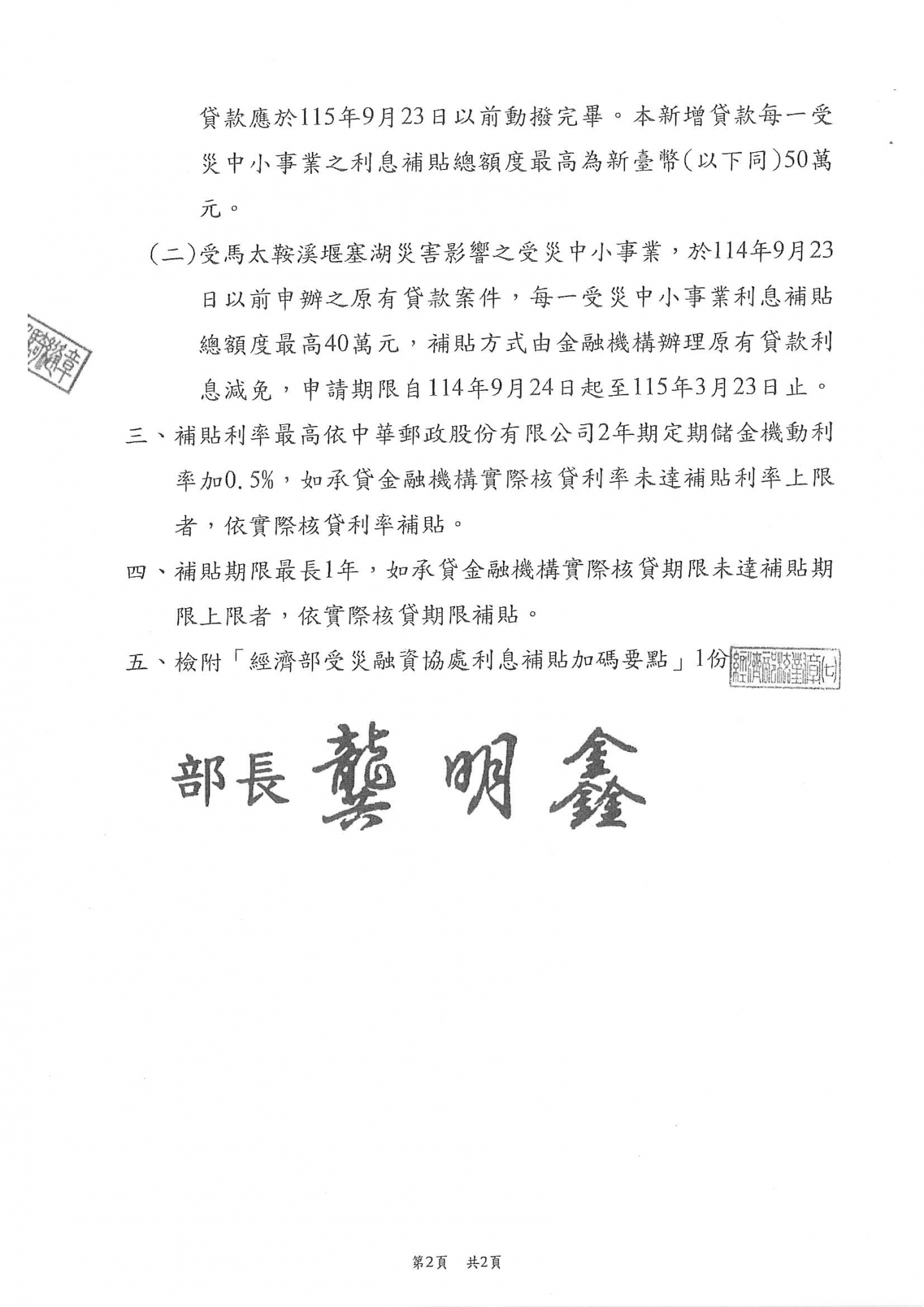 經濟部為協助受馬太鞍溪堰塞湖災害影響之受災中小事業檢送「經濟部受災融資協處利息補貼加碼要點」適用對象等公告影本,並自中華民國114年9月24日生效