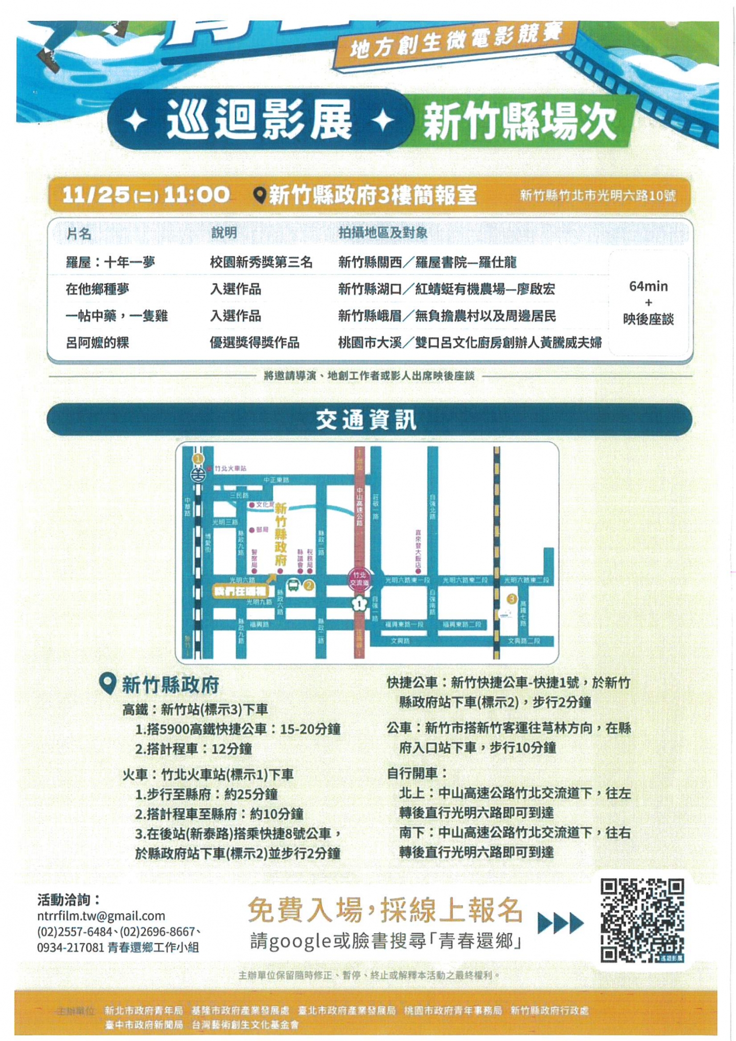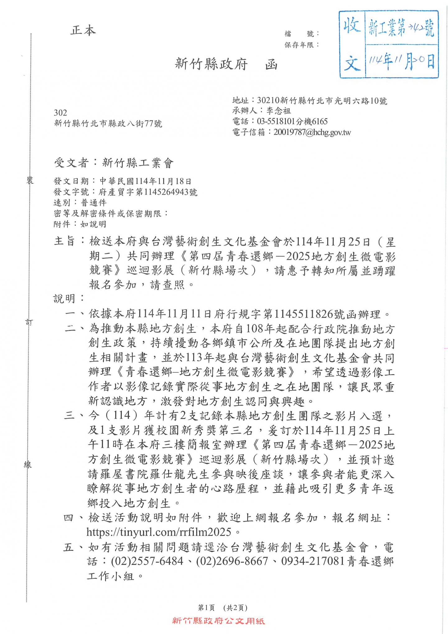 新竹縣政府與台灣藝術創生文化基金會於114年11月25日(星期二)共同辦理《第四屆青春還鄉-2025地方創生微電影 競賽》巡迴影展(新竹縣場次),歡迎企業單位蒞臨參與