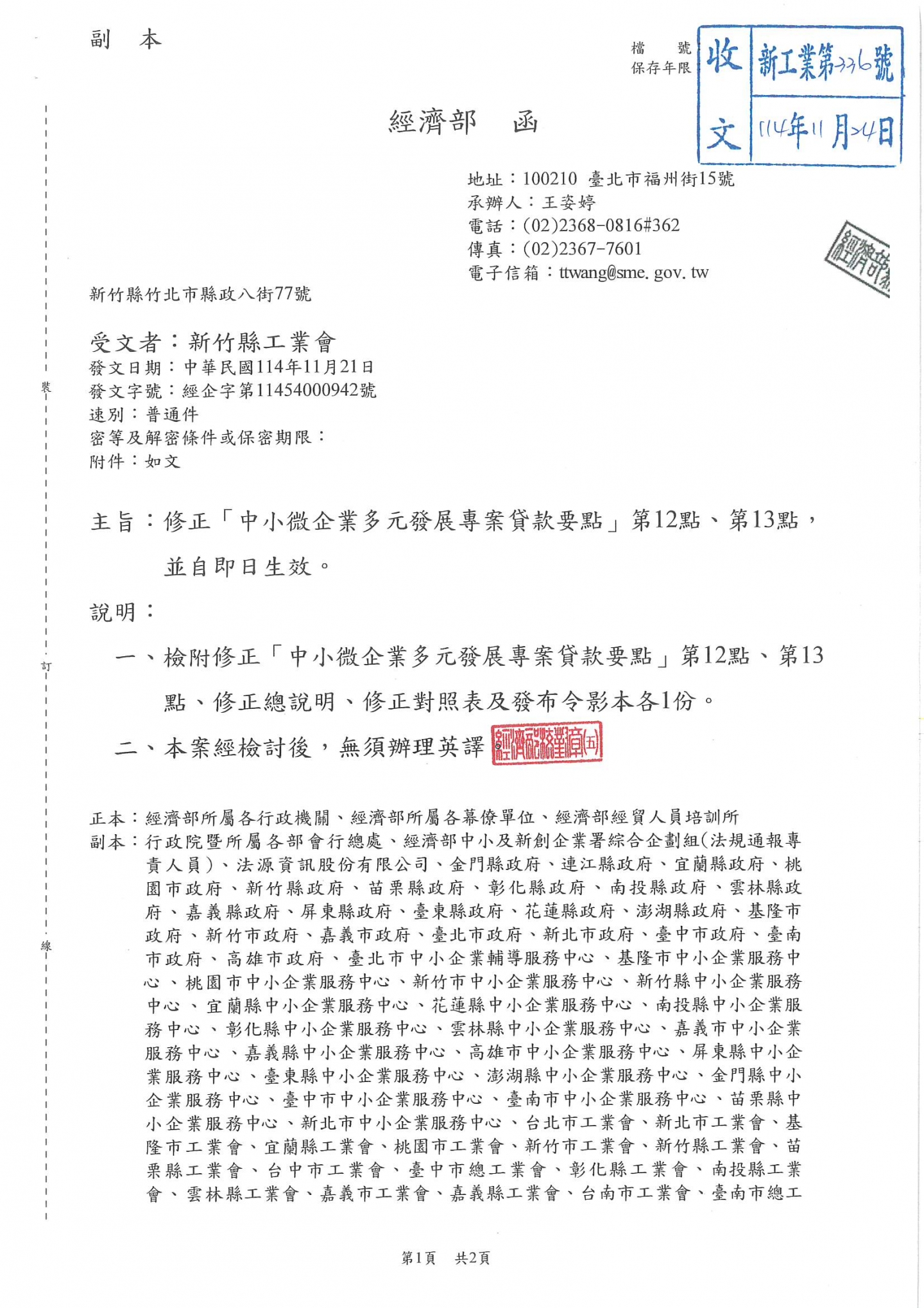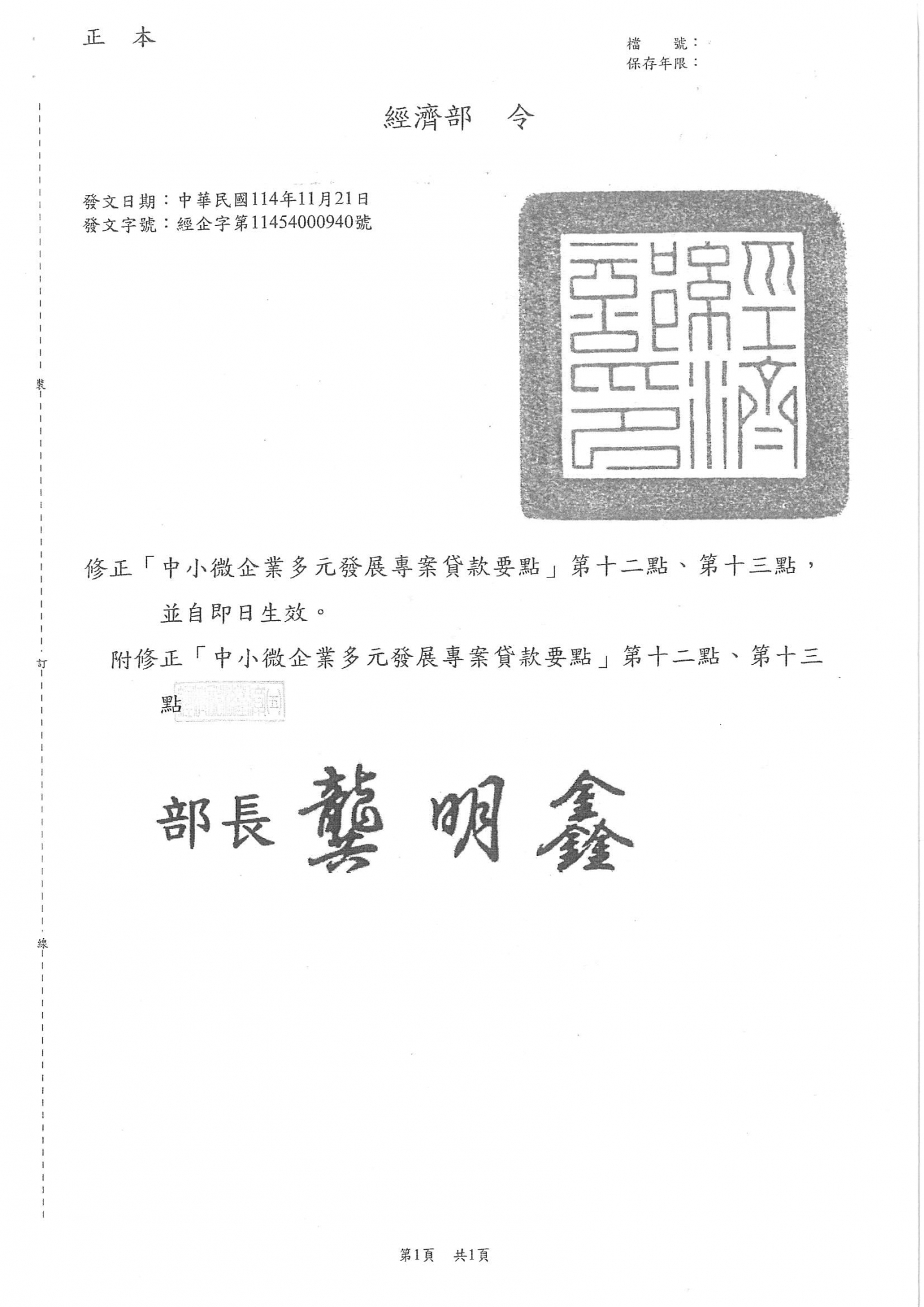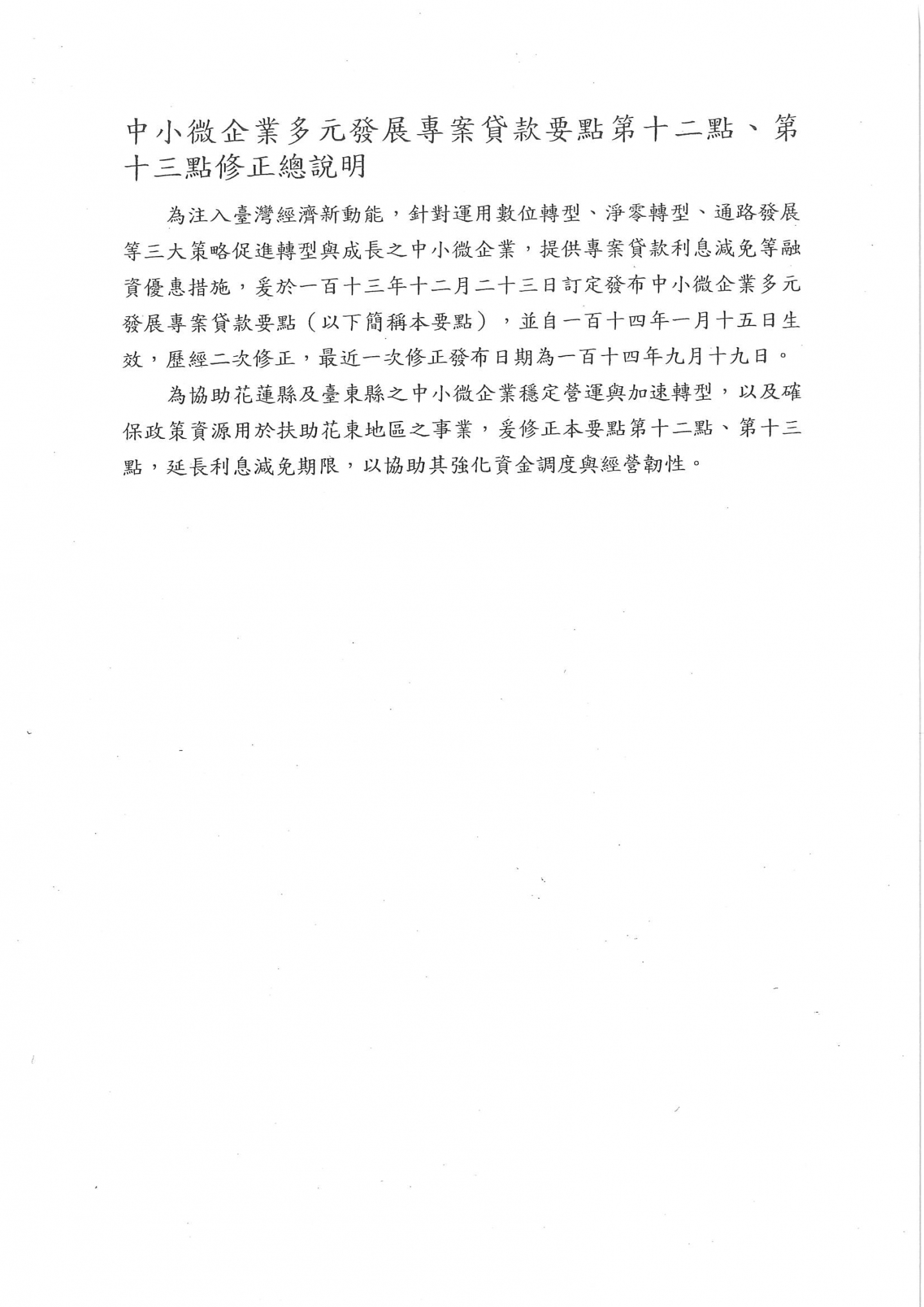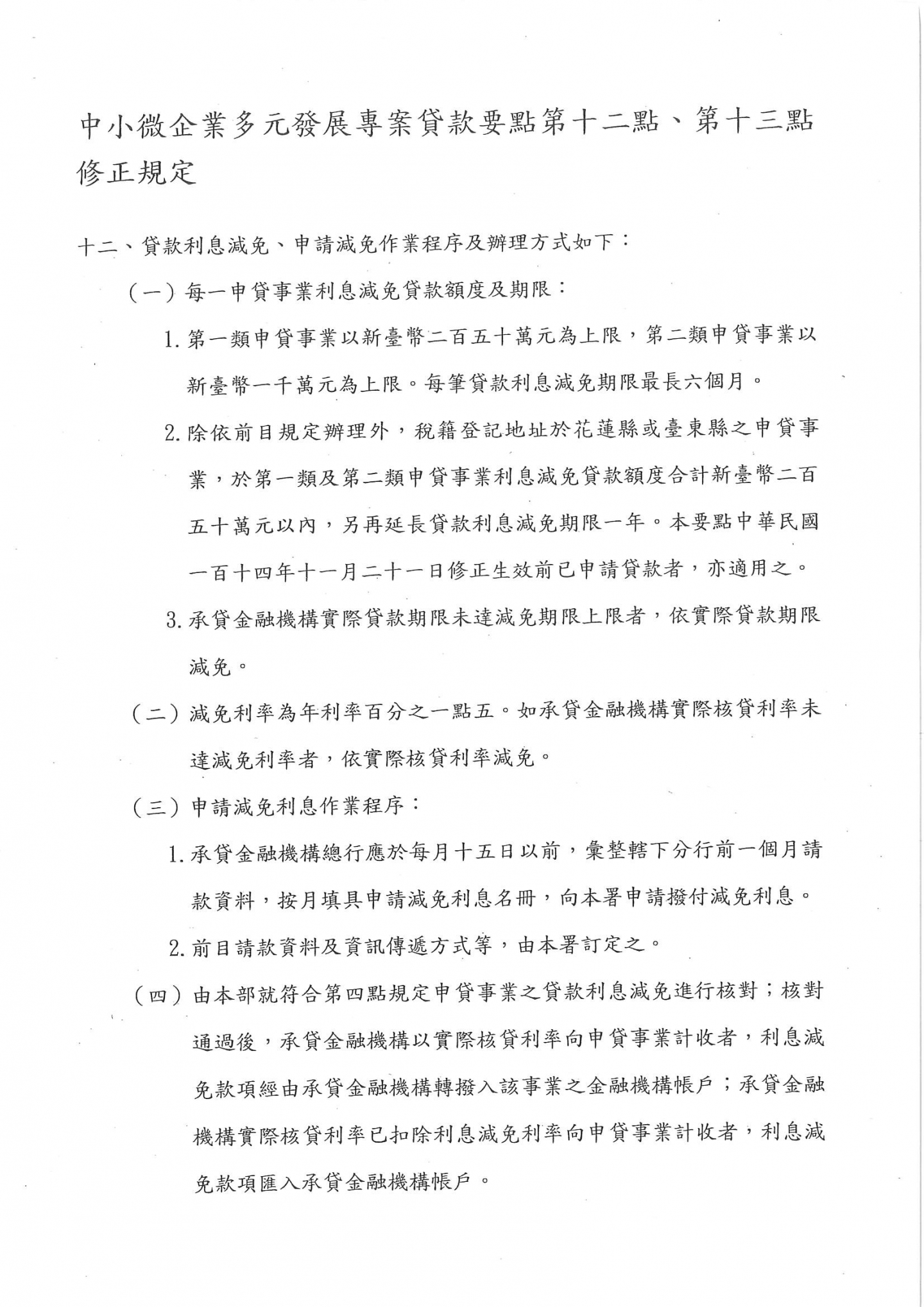 經濟部修正「中小微企業多元發展專案貸款要點」第12點、第13點,請相關事業單位留意