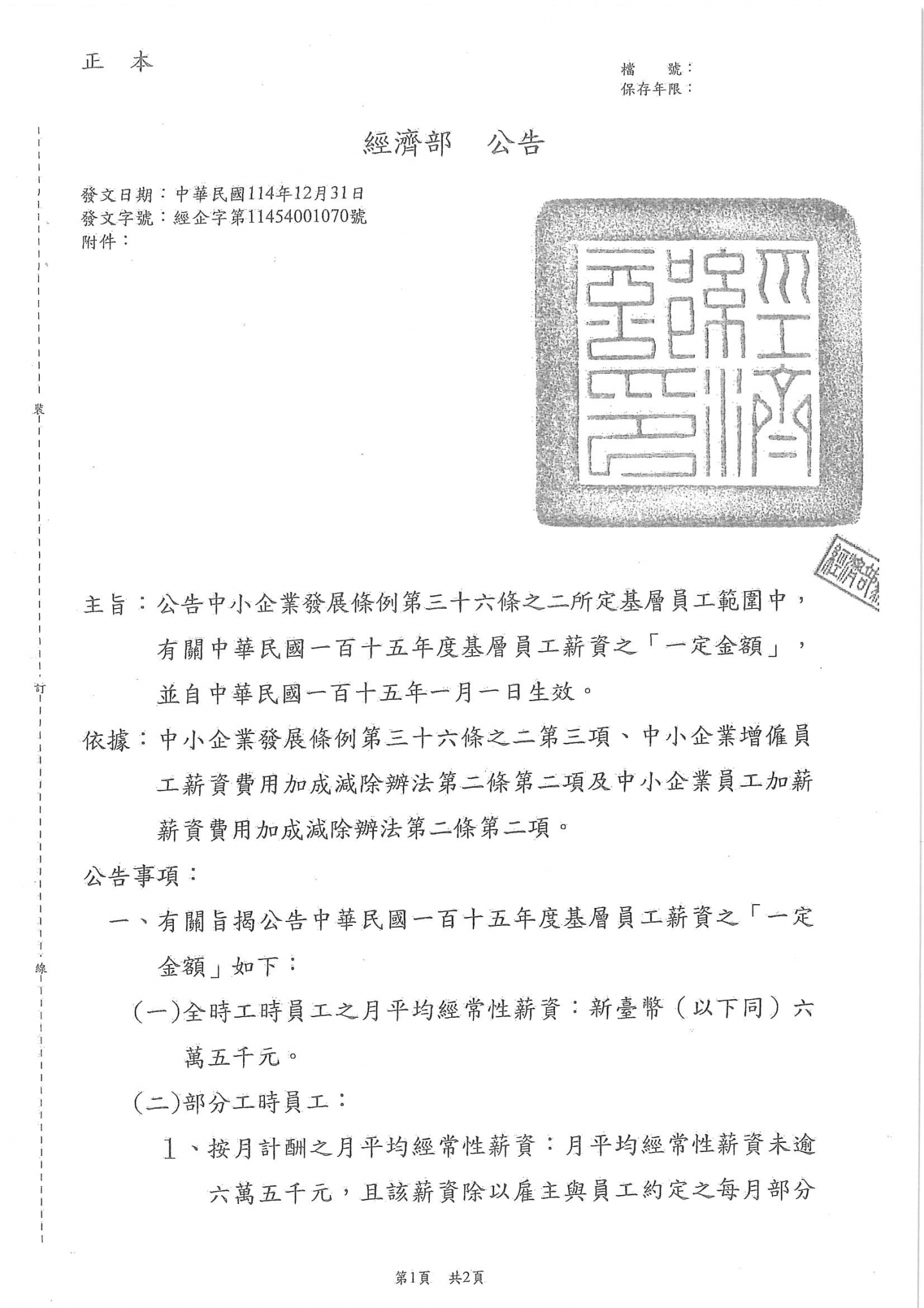 經濟部於中華民國114年12月31日以經企字第11454001070號公告訂定,請相關單位企業留意查閱