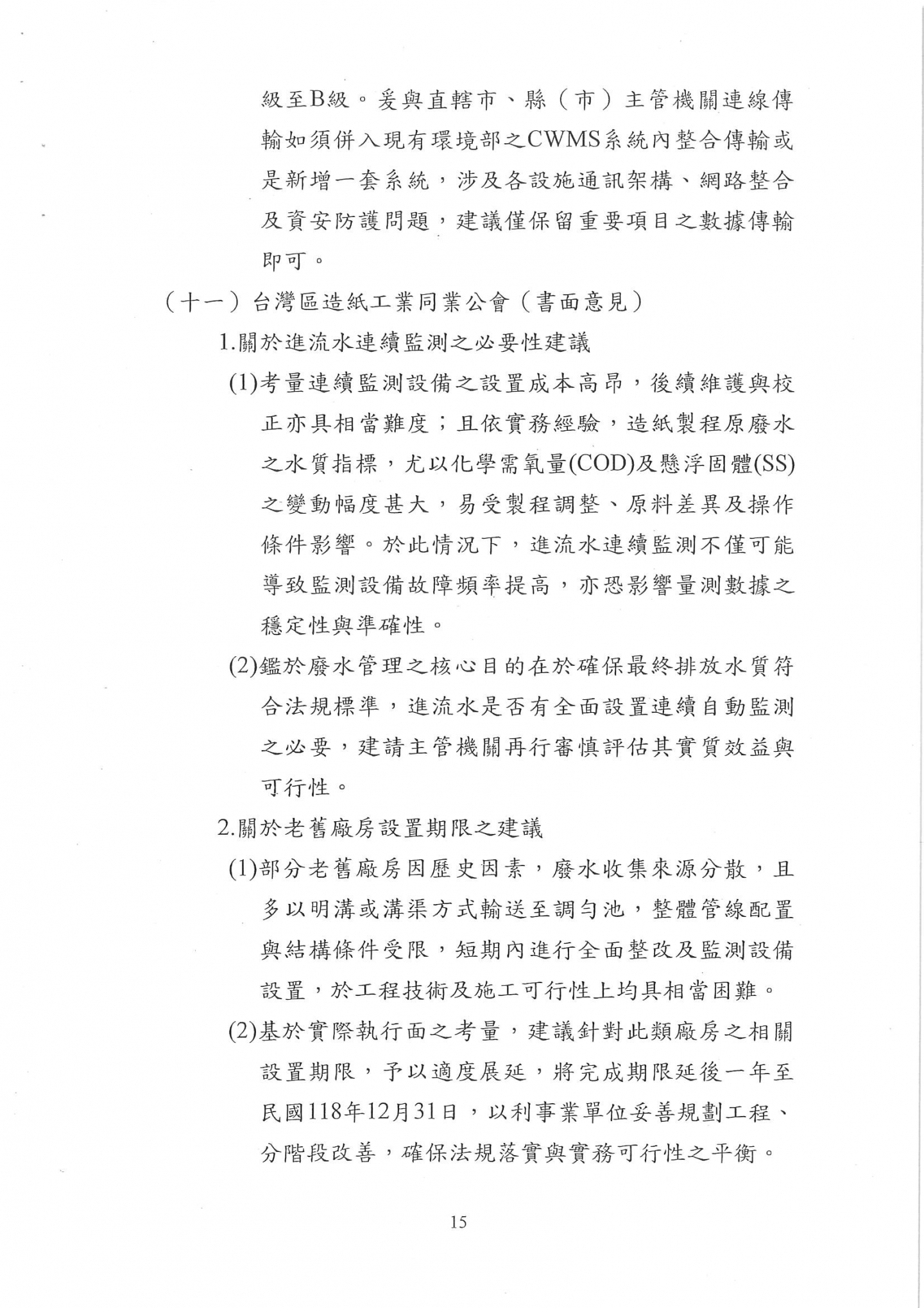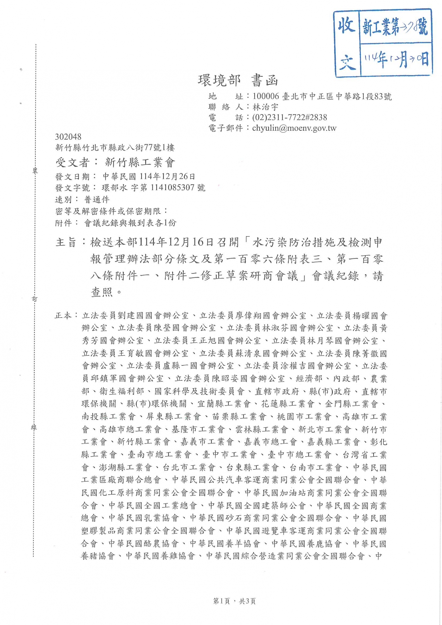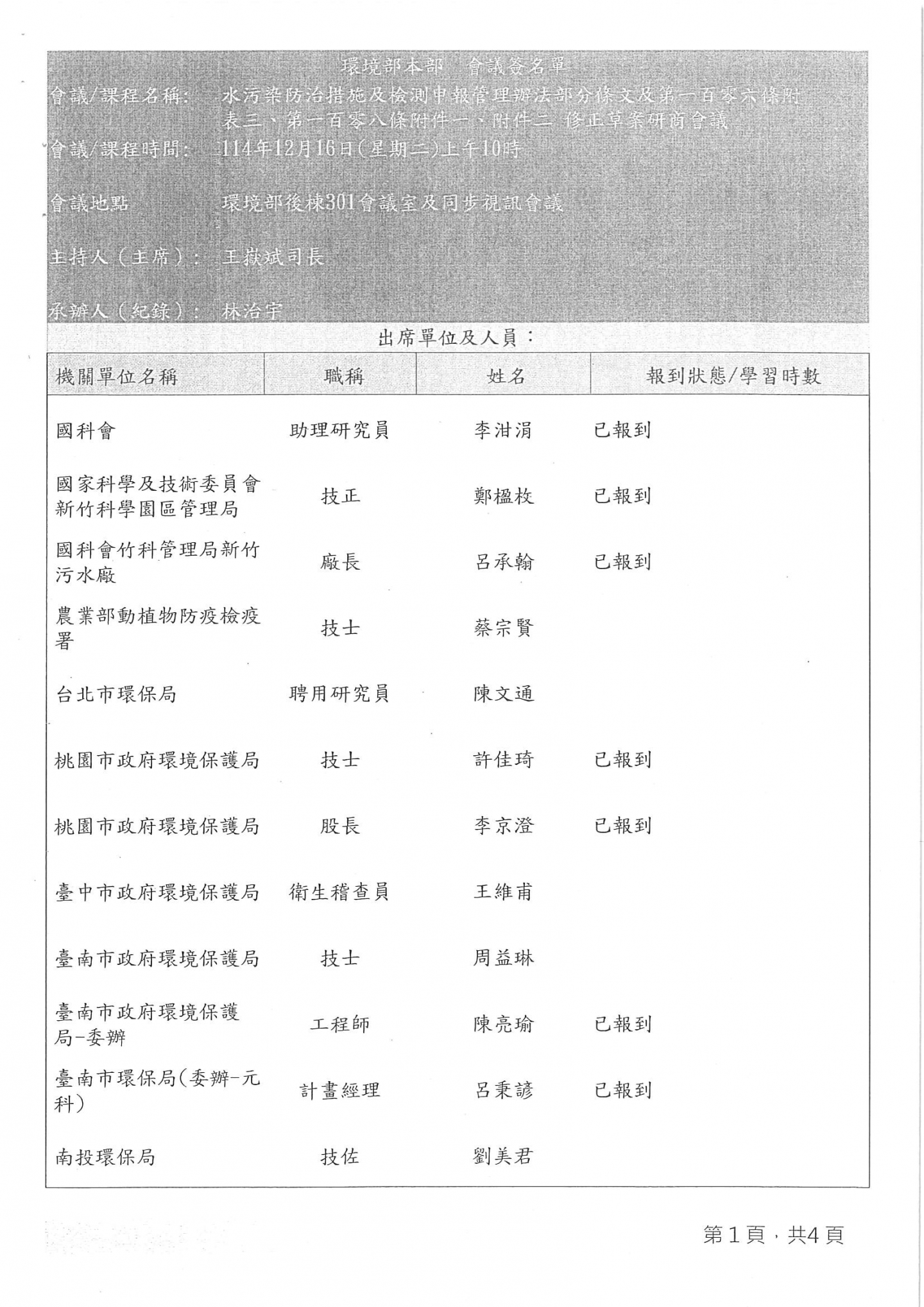 環境部114年12月16日召開「水汙染防治措施及檢測申報管理辦法部分條文及第106條附表三、第108條附件一、附件二修正草案研商會議」會議記錄