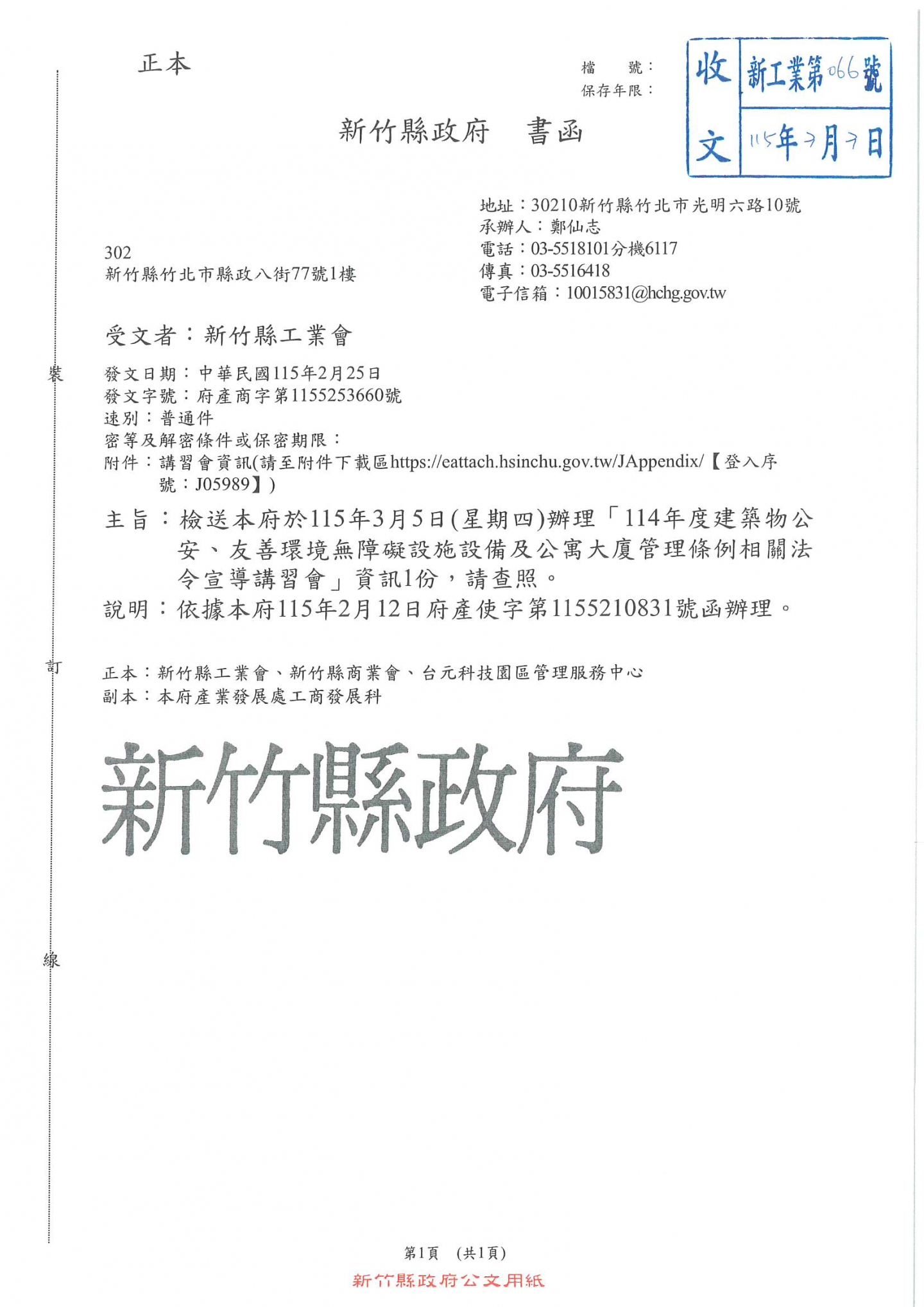 新竹縣政府書函:檢送本府於115年3月5日(星期四)辦理「114年度建築物公安、友善環境無障礙設施設備及公寓大廈管理條例相關法令宣導講習會」資訊1份、請相關企業留意。