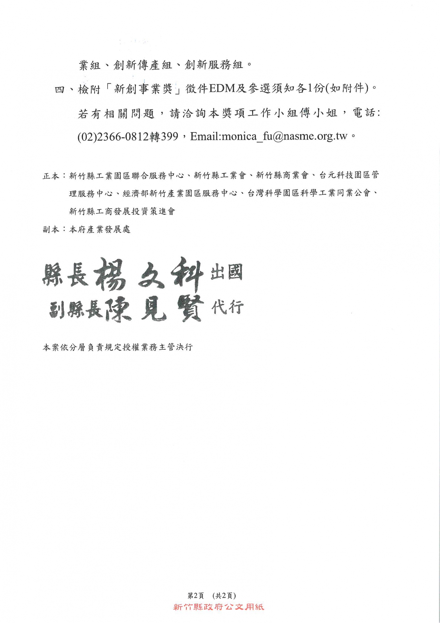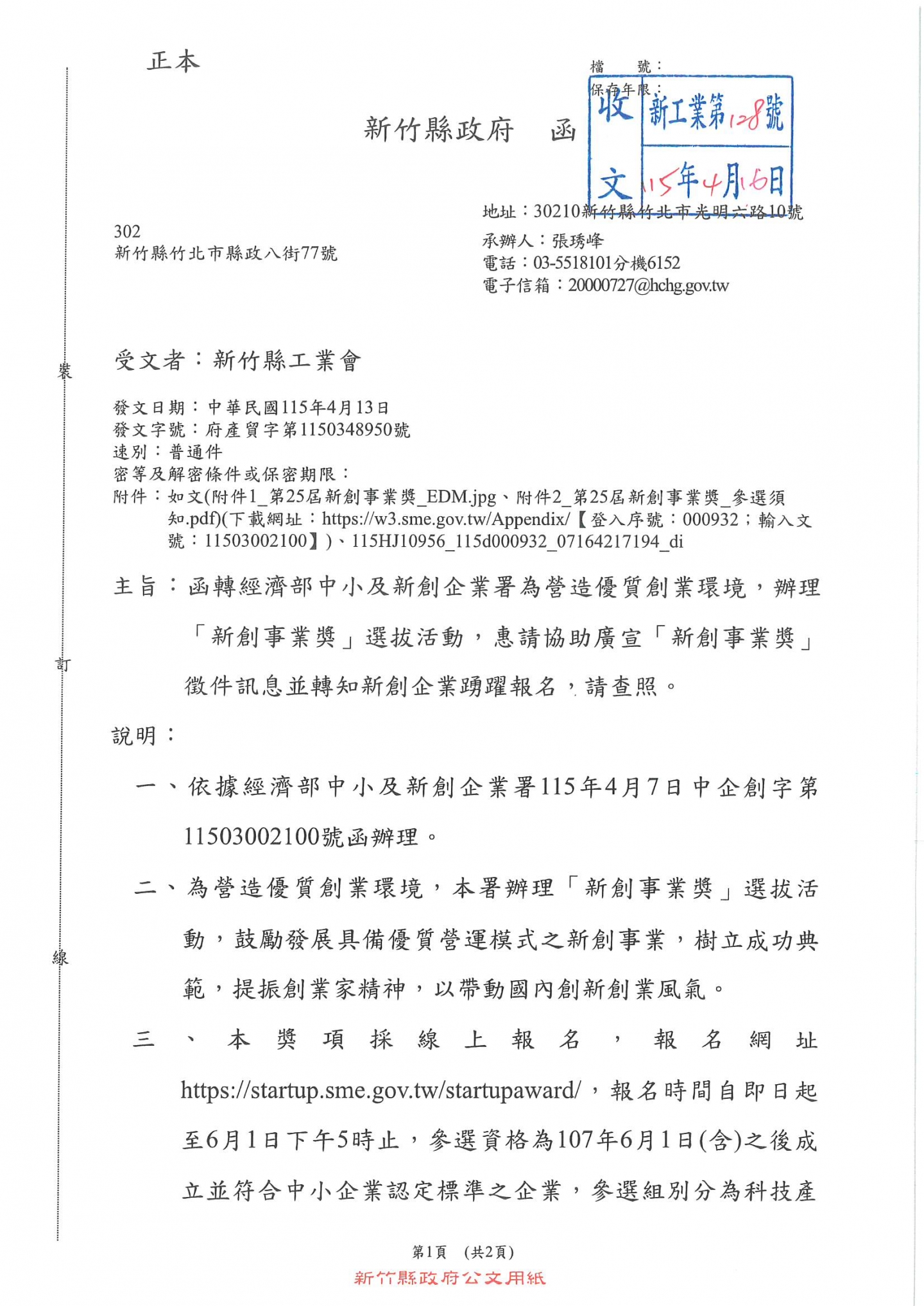 新竹縣政府函:函轉經濟部中小及新創企業署為營造優質創業環境,辦理「新創事業獎」選拔活動,請相關單位踴躍參加。