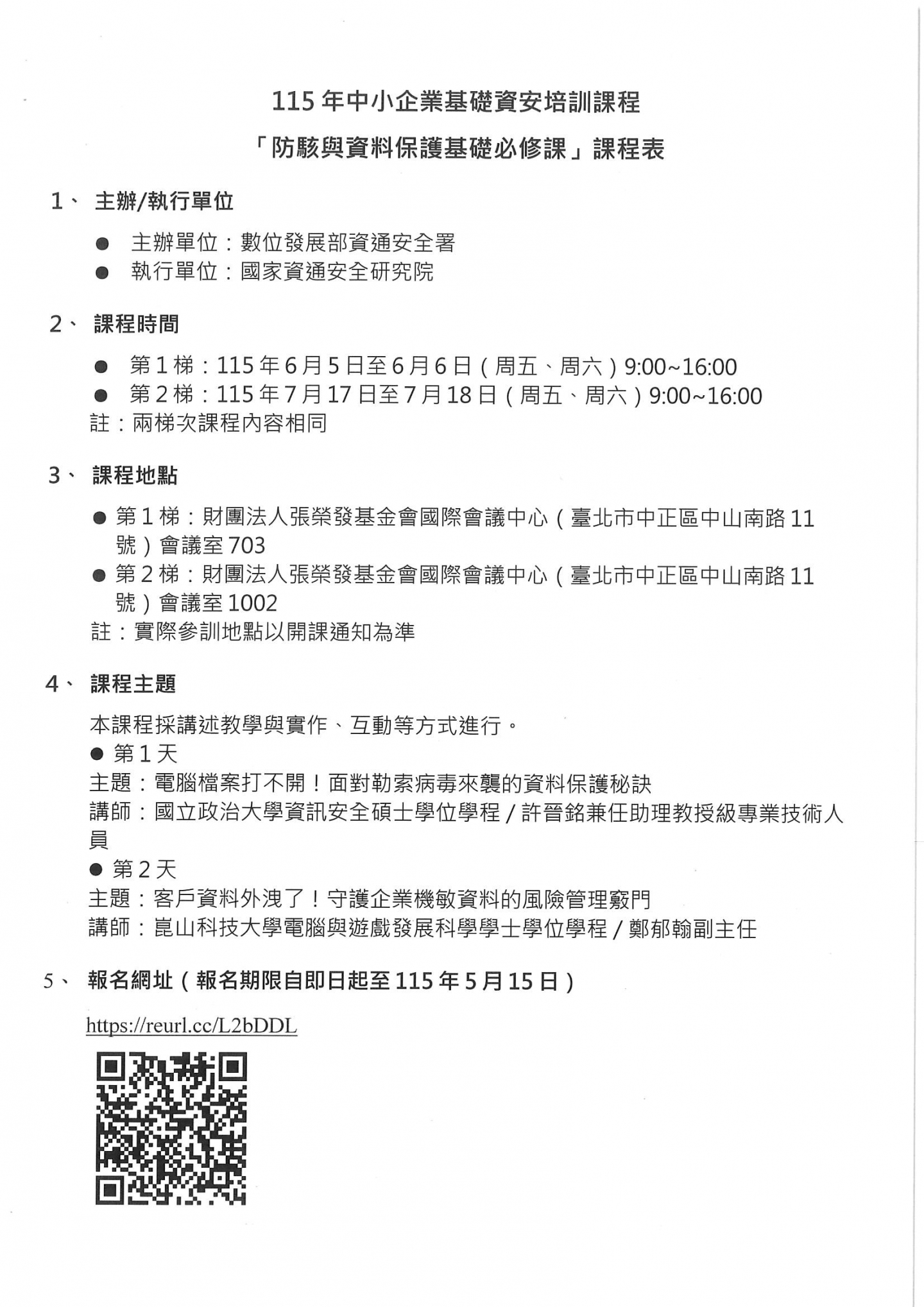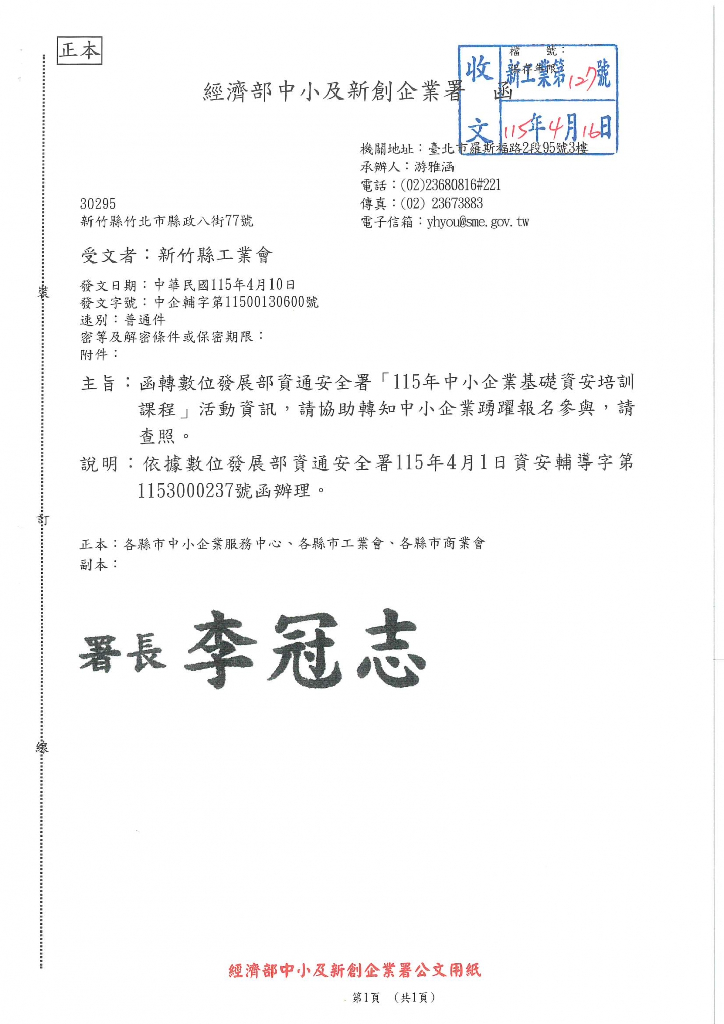 經濟部中小及新創企業署函:函轉數位發展部資通安全署「115年中小企業基礎資安培訓課程」活動資訊,請相關企業踴躍參加。