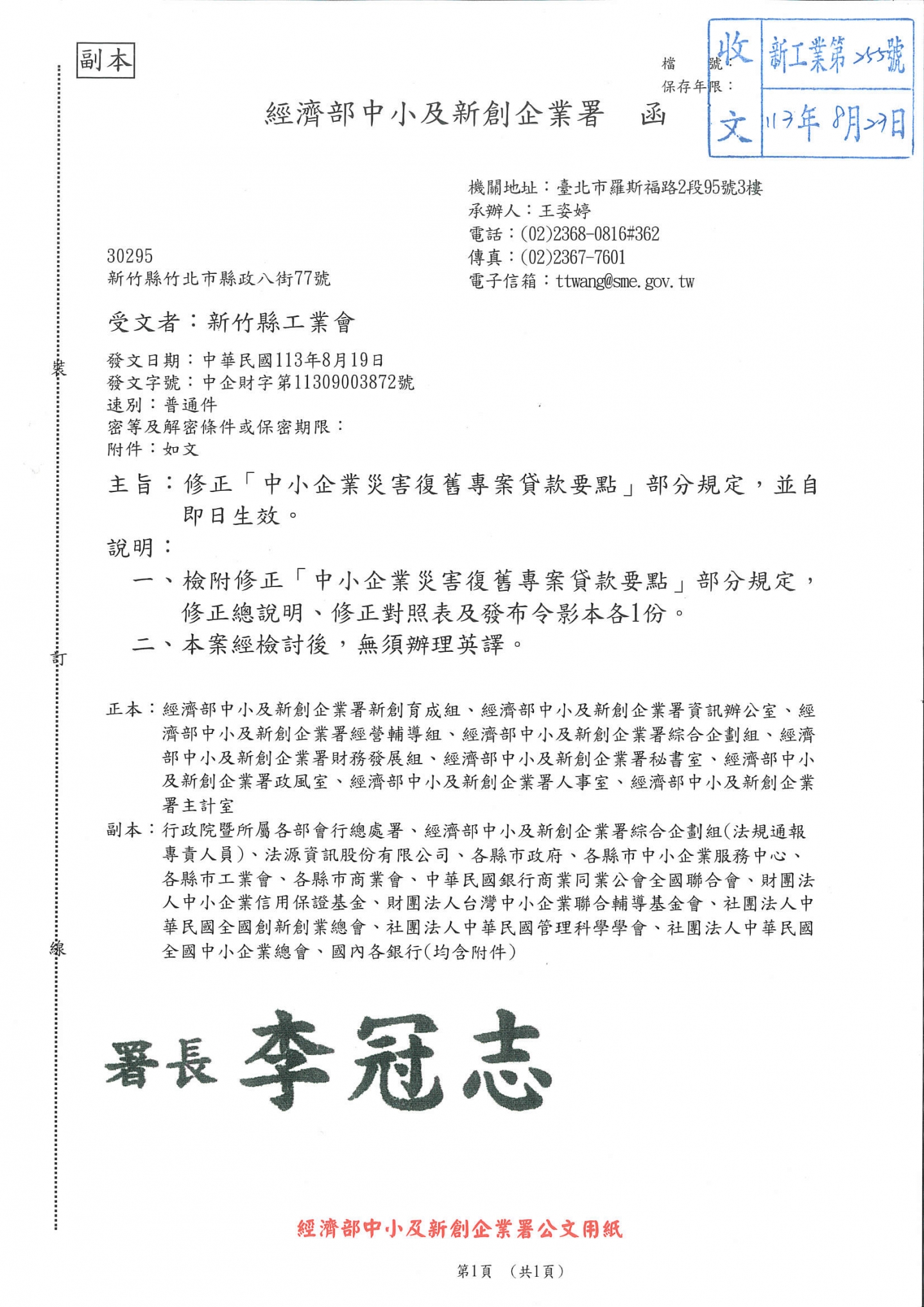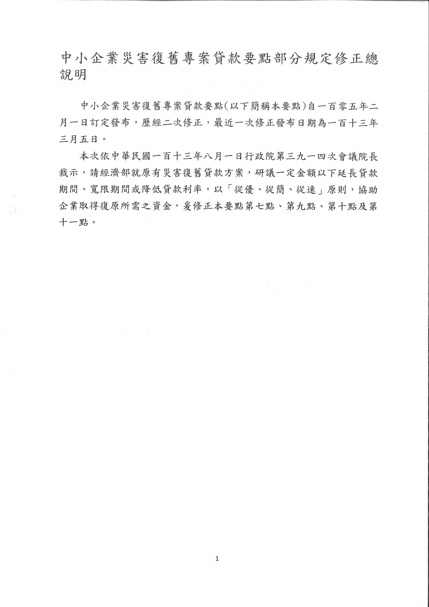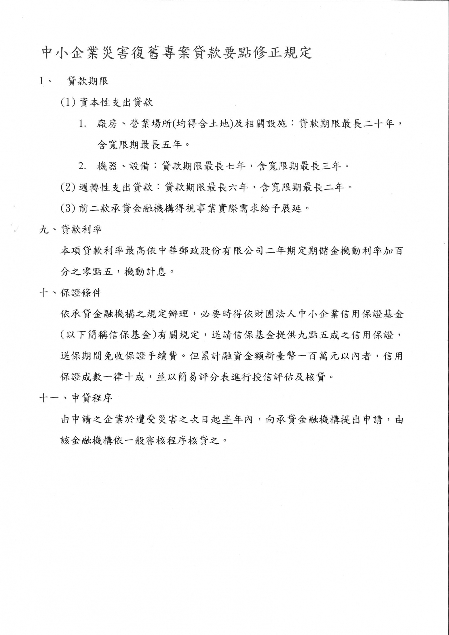 修正"中小企業災害復舊專案貸款要點"部分規定,並自即日起生效!