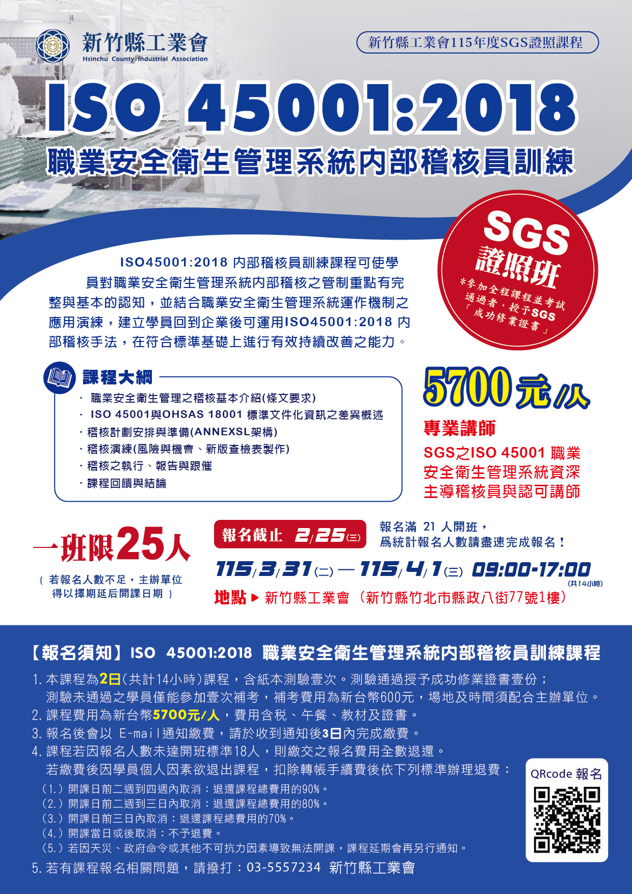 【SGS證照班】115/3/31-4/1(二、三) ISO 45001:2018 職業安全衛生管理系統 內部稽核員訓練課程
