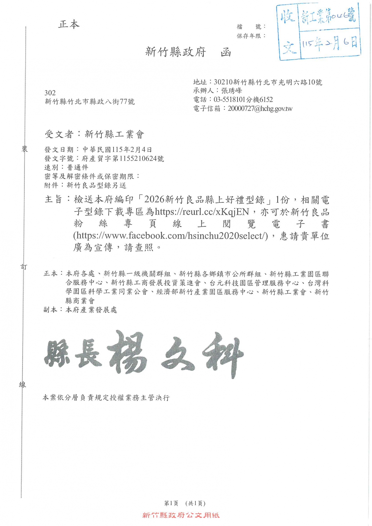 新竹縣政府編印「2026新竹良品縣上好禮型錄」歡迎企業單位踴躍參閱