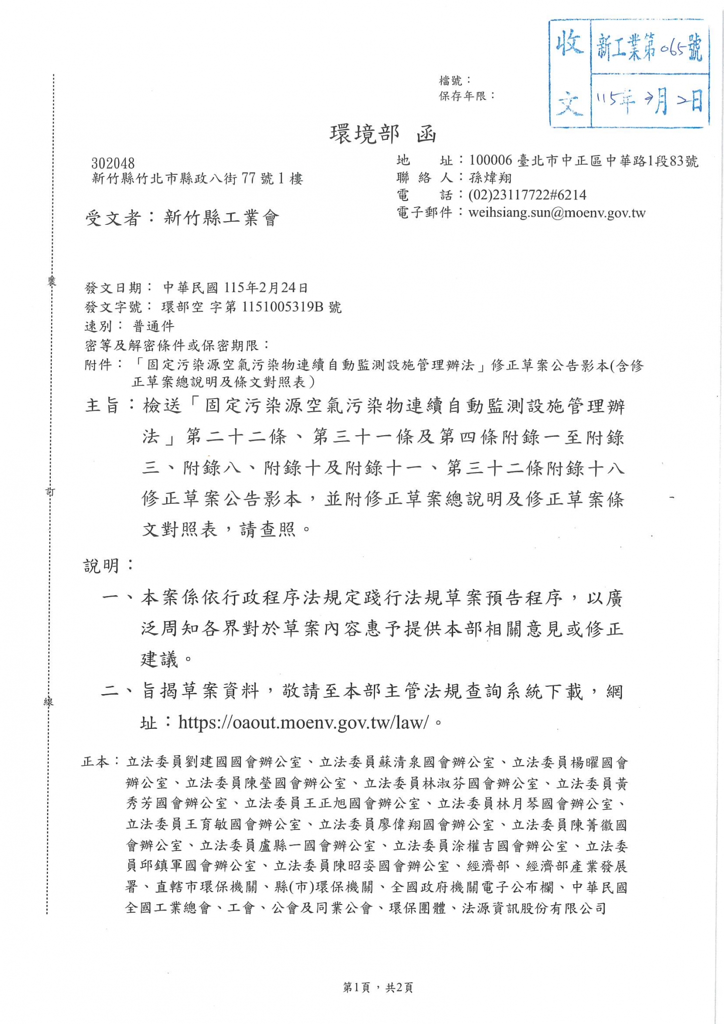 環境部函:檢送「固定汙染源空氣汙染物連續自動監測設施管理辦法」第二十二條、第三十一條及第四條附錄醫治附錄三、附錄八、附錄十及附錄十一、第三十二條附錄十八修正草案公告影本,請相關企業留意。
