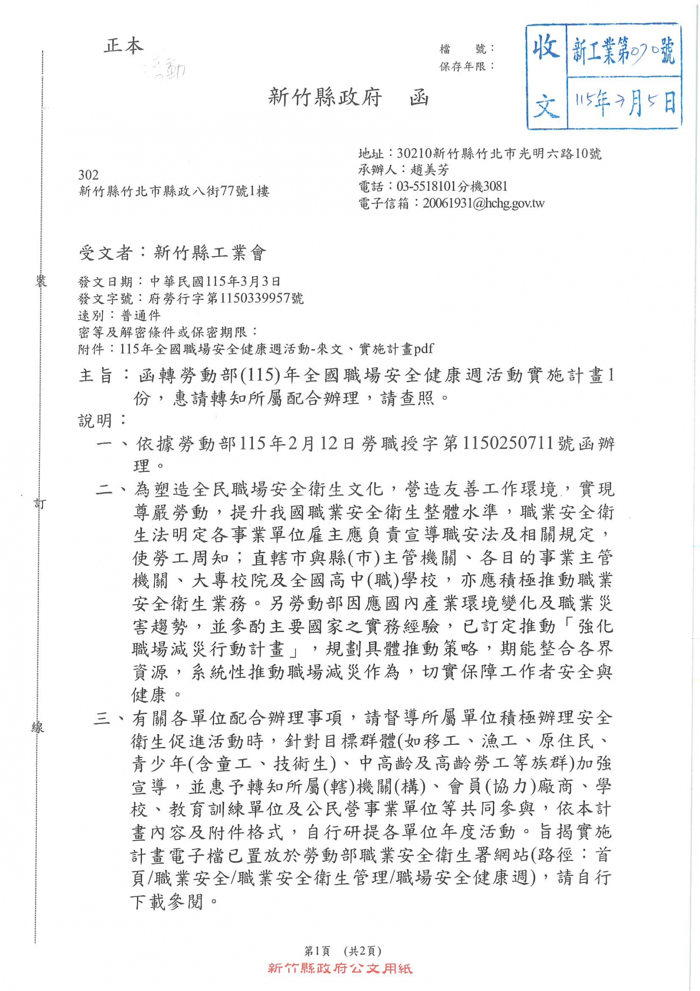 新竹縣政府函:函轉勞動部(115)年全國職場安全健康週活動實施計畫1份,請相關企業留意。