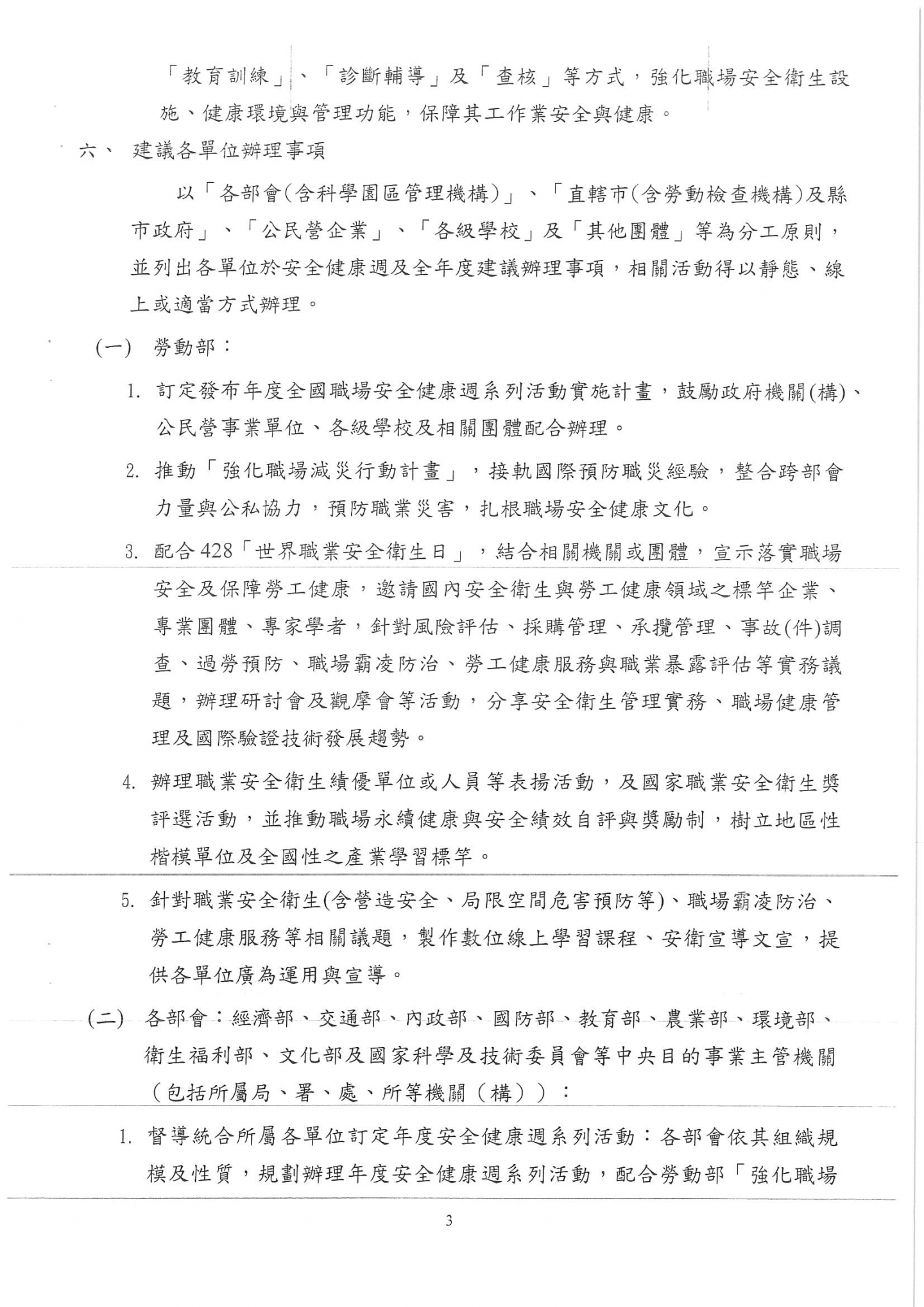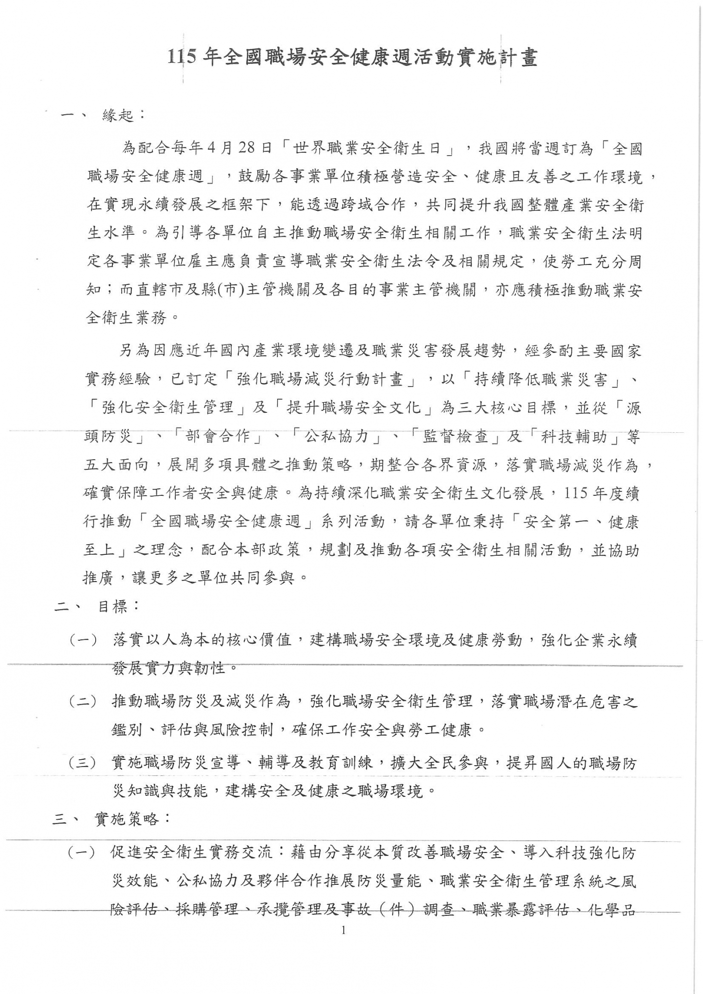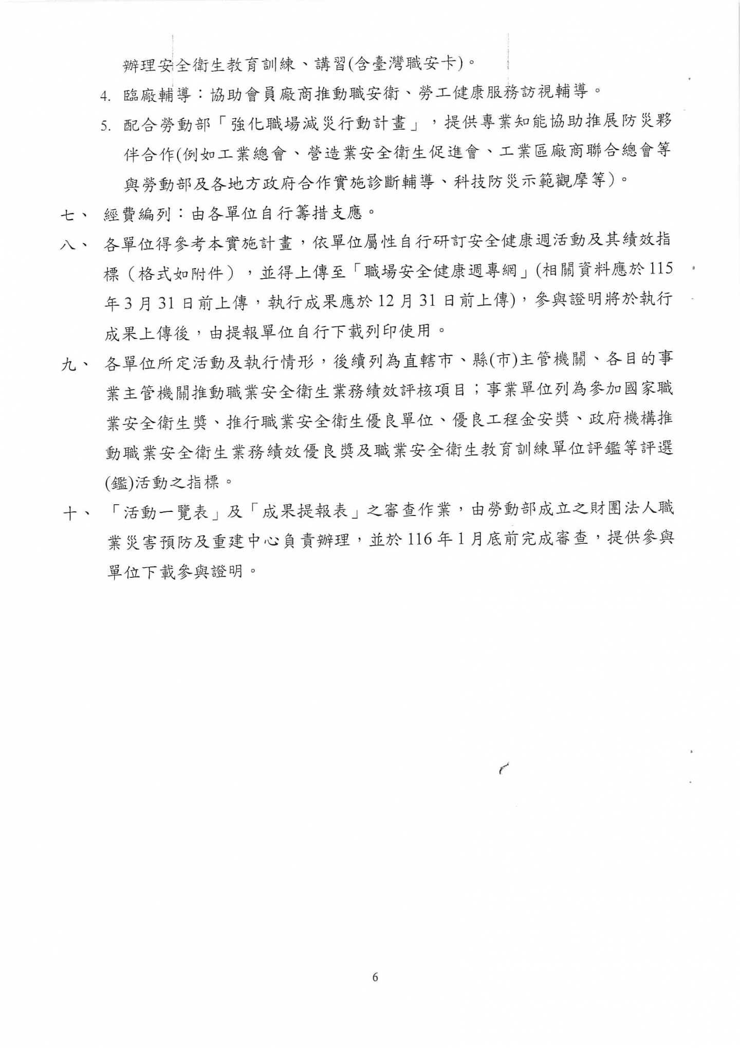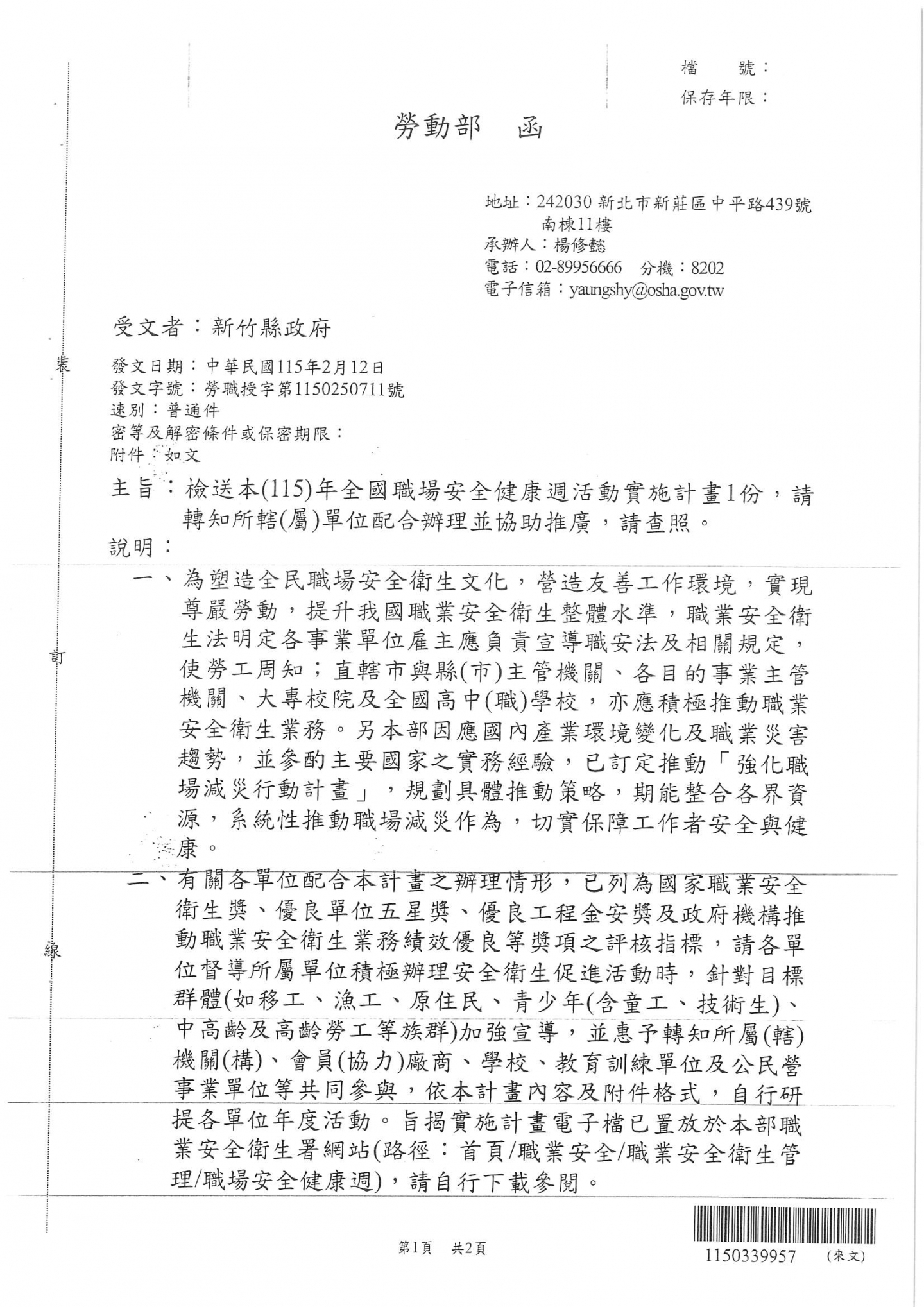 勞動部函 檢送本(115)年全國職場安全健康週活動濕濕計畫1份,請相關企業留意。