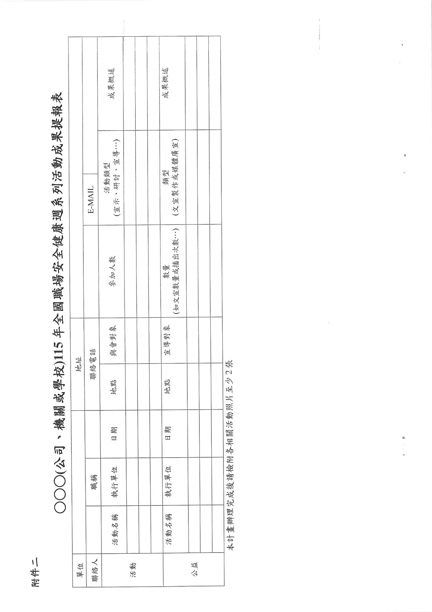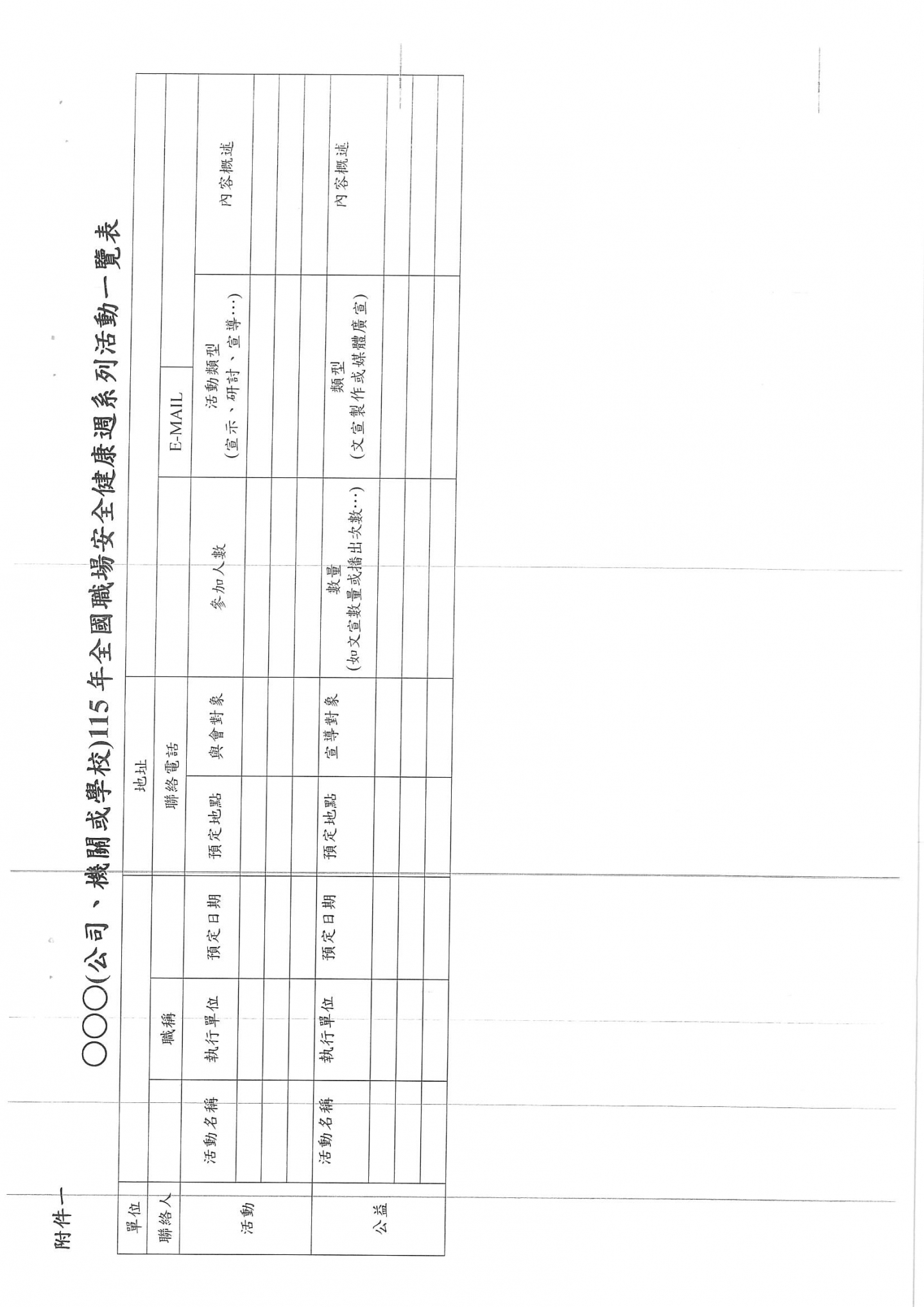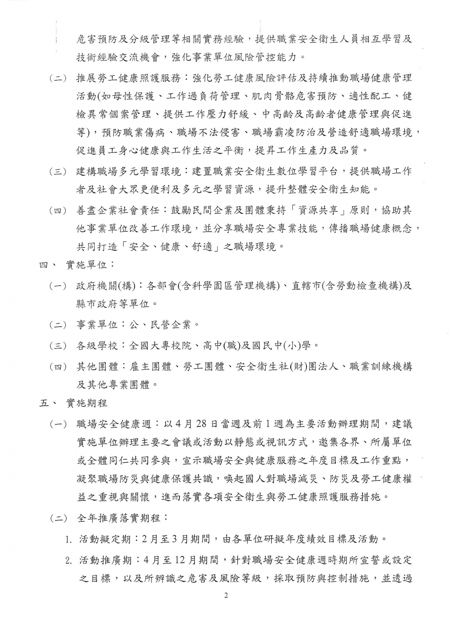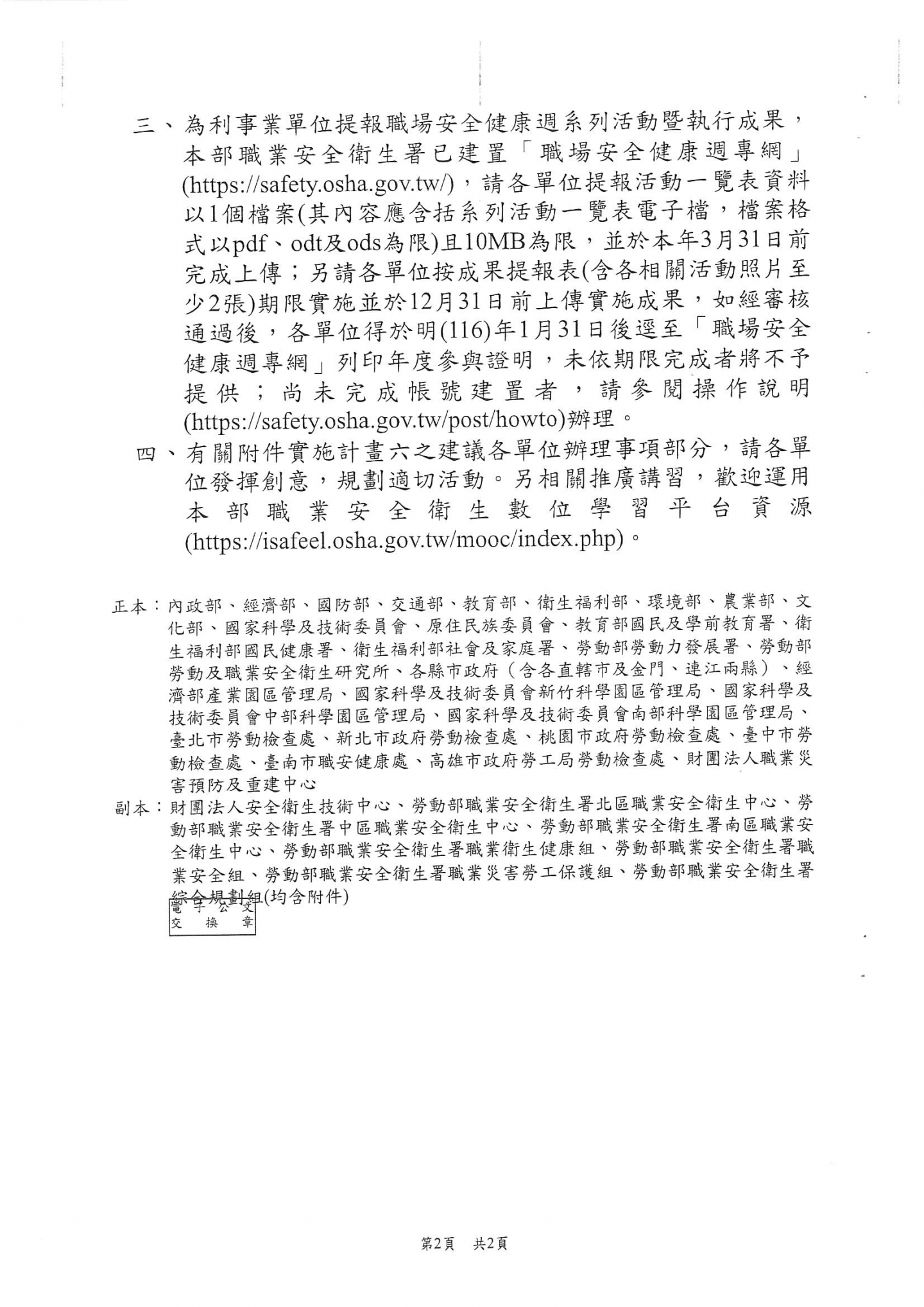 勞動部函 檢送本(115)年全國職場安全健康週活動濕濕計畫1份,請相關企業留意。
